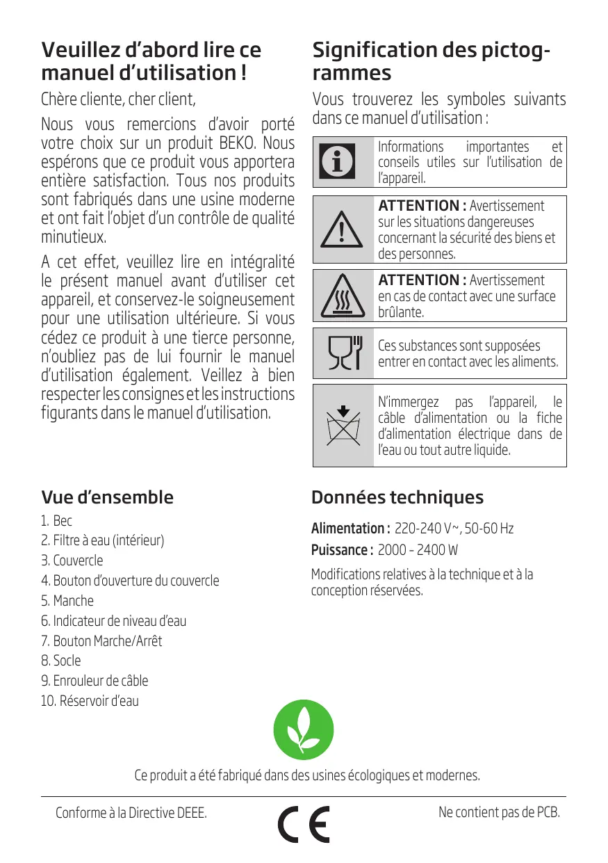 Vous trouverez les symboles suivants Nous vous remercions d’avoir porté dans ce manuel d’utilisation : votre choix sur un produit BEKO. Nous Informations importantes et conseils utiles sur l’utilisation de espérons que ce produit vous apportera l’appareil. entière satisfaction. Tous nos produits sont fabriqués dans une usine moderne ATTENTION : Avertissement et ont fait l’objet d’un contrôle de qualité sur les situations dangereuses concernant la sécurité des biens et minutieux. des personnes. A cet effet, veuillez lire en intégralité ATTENTION : Avertissement le présent manuel avant d’utiliser cet en cas de contact avec une surface appareil, et conservez-le soigneusement brûlante. pour une utilisation ultérieure. Si vous cédez ce produit à une tierce personne, Ces substances sont supposées n’oubliez pas de lui fournir le manuel entrer en contact avec les aliments. d’utilisation également. Veillez à bien respecter les consignes et les instructions N’immergez pas l’appareil, le figurants dans le manuel d’utilisation. câble d’alimentation ou la fiche