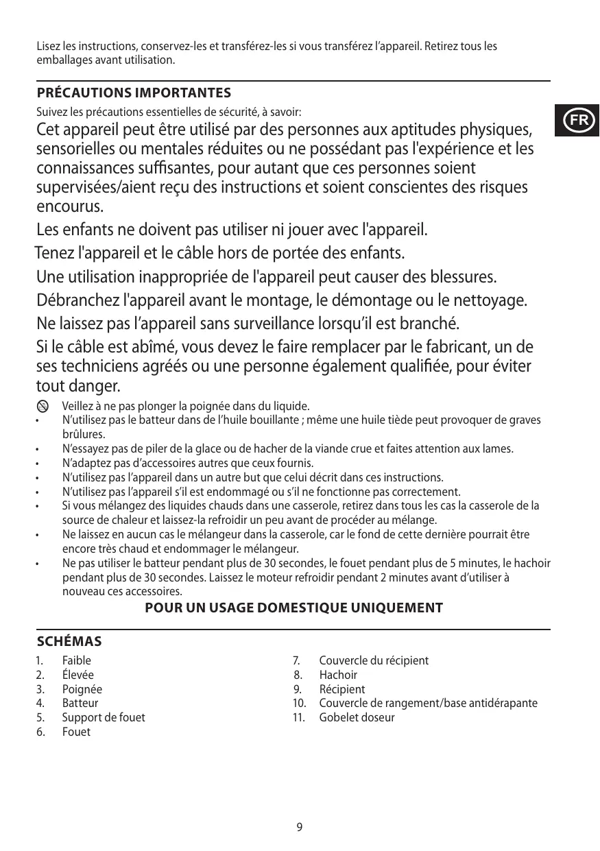 N’utilisez pas le batteur dans de l’huile bouillante ; même une huile tiède peut provoquer de graves brûlures. N’essayez pas de piler de la glace ou de hacher de la viande crue et faites attention aux lames. N’adaptez pas d’accessoires autres que ceux fournis. N’utilisez pas l’appareil dans un autre but que celui décrit dans ces instructions. N’utilisez pas l’appareil s’il est endommagé ou s’il ne fonctionne pas correctement. Si vous mélangez des liquides chauds dans une casserole, retirez dans tous les cas la casserole de la source de chaleur et laissez-la refroidir un peu avant de procéder au mélange. Ne laissez en aucun cas le mélangeur dans la casserole, car le fond de cette dernière pourrait être encore très chaud et endommager le mélangeur. Ne pas utiliser le batteur pendant plus de 30 secondes, le fouet pendant plus de 5 minutes, le hachoir pendant plus de 30 secondes. Laissez le moteur refroidir pendant 2 minutes avant d’utiliser à nouveau ces accessoires.