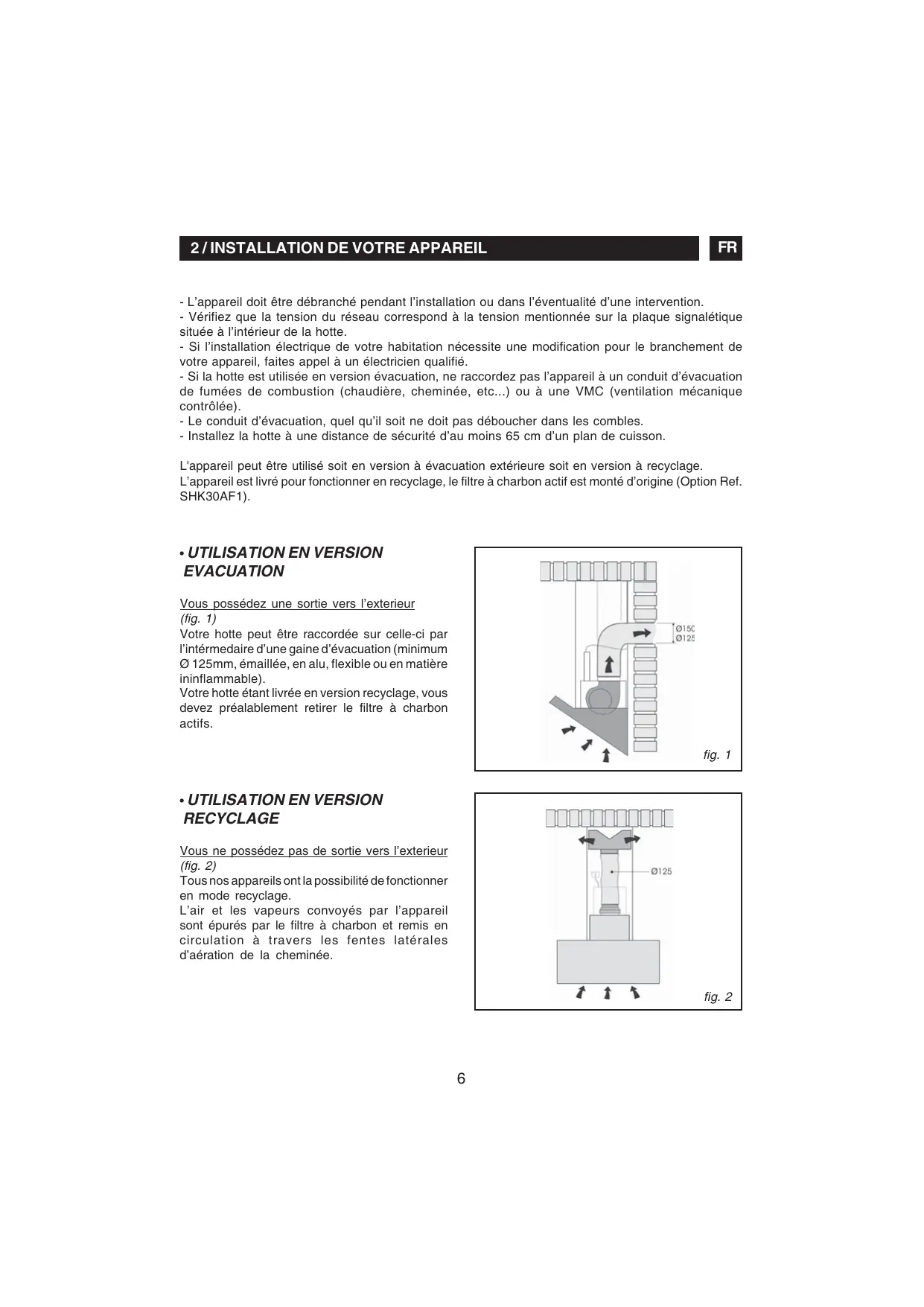 - L’appareil doit être débranché pendant l’installation ou dans l’éventualité d’une intervention. - Vérifiez que la tension du réseau correspond à la tension mentionnée sur la plaque signalétique située à l’intérieur de la hotte. - Si l’installation électrique de votre habitation nécessite une modification pour le branchement de votre appareil, faites appel à un électricien qualifié. - Si la hotte est utilisée en version évacuation, ne raccordez pas l’appareil à un conduit d’évacuation de fumées de combustion (chaudière, cheminée, etc...) ou à une VMC (ventilation mécanique contrôlée). - Le conduit d’évacuation, quel qu’il soit ne doit pas déboucher dans les combles. - Installez la hotte à une distance de sécurité d’au moins 65 cm d’un plan de cuisson. L'appareil peut être utilisé soit en version à évacuation extérieure soit en version à recyclage. L’appareil est livré pour fonctionner en recyclage, le filtre à charbon actif est monté d’origine (Option Ref. SHK30AF1).