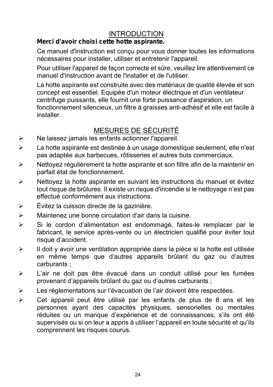 La hotte aspirante est construite avec des matériaux de qualité élevée et son concept est essentiel. Equipée d'un moteur électrique et d'un ventilateur centrifuge puissants, elle fournit une forte puissance d'aspiration, un fonctionnement silencieux, un filtre à graisses anti-adhésif et elle est facile à installer. Nettoyez régulièrement la hotte aspirante et son filtre afin de la maintenir en parfait état de fonctionnement. Nettoyez la hotte aspirante en suivant les instructions du manuel et évitez tout risque de brûlures. Il existe un risque d'incendie si le nettoyage n’est pas effectué conformément aux instructions. Évitez la cuisson directe de la gazinière. Maintenez une bonne circulation d'air dans la cuisine. Si le cordon d’alimentation est endommagé, faites-le remplacer par le fabricant, le service après-vente ou un électricien qualifié pour éviter tout risque d’accident. Il doit y avoir une ventilation appropriée dans la pièce si la hotte est utilisée en même temps que d’autres appareils brûlant du gaz ou d’autres carburants ; L’air ne doit pas être évacué dans un conduit utilisé pour les fumées provenant d’appareils brûlant du gaz ou d’autres carburants ; Les réglementations sur l’évacuation de l’air doivent être respectées. Cet appareil peut être utilisé par les enfants de plus de 8 ans et les personnes ayant des capacités physiques, sensorielles ou mentales réduites ou un manque d’expérience et de connaissances, s’ils ont été supervisés ou si on leur a appris à utiliser l’appareil en toute sécurité et qu’ils comprennent les risques courus.