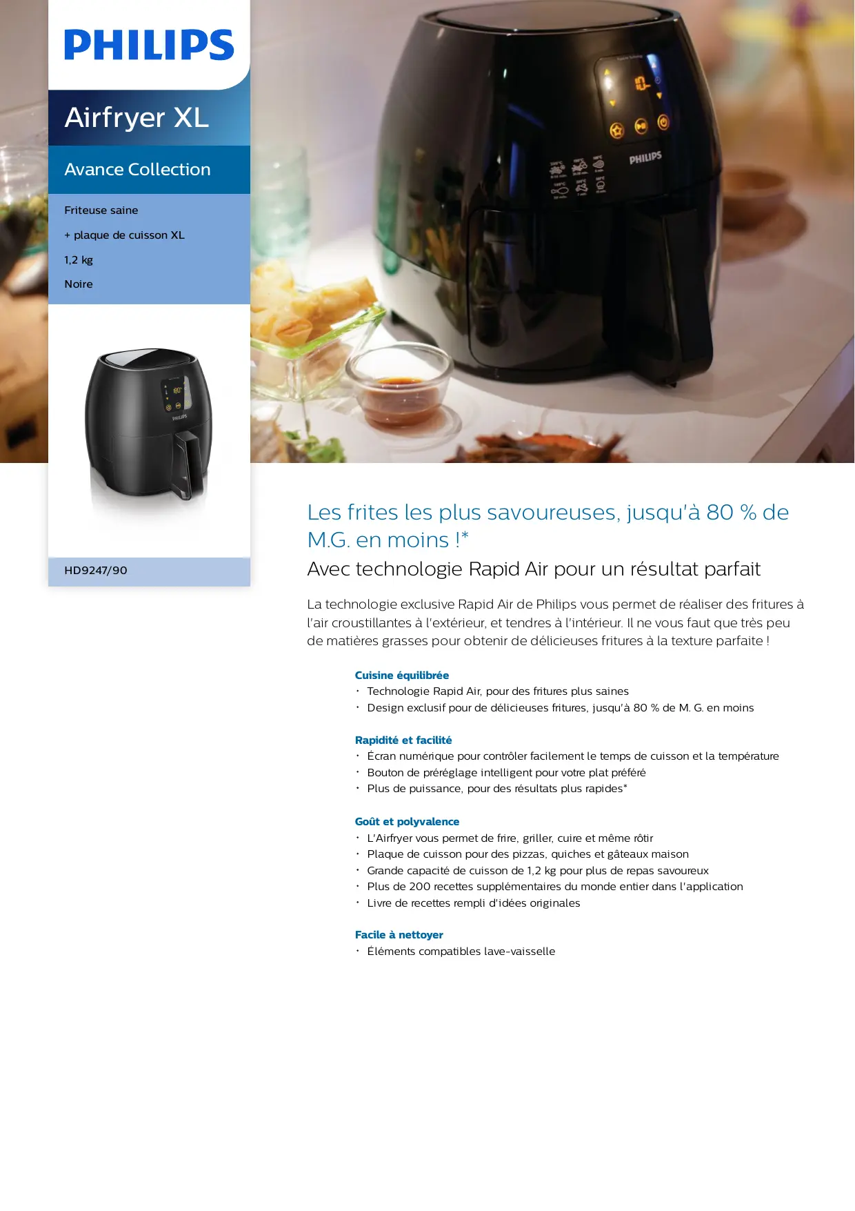 Airfryer XL Avance Collection Friteuse saine + plaque de cuisson XL 1,2 kg Noire Les frites les plus savoureuses, jusqu'à 80 % de M.G. en moins !* HD9247/90 Avec technologie Rapid Air pour un résultat parfait La technologie exclusive Rapid Air de Philips vous permet de réaliser des fritures à l'air croustillantes à l'extérieur, et tendres à l'intérieur. Il ne vous faut que très peu de matières grasses pour obtenir de délicieuses fritures à la texture parfaite ! Cuisine équilibrée Technologie Rapid Air, pour des fritures plus saines Design exclusif pour de délicieuses fritures, jusqu'à 80 % de M. G. en moins Rapidité et facilité Écran numérique pour contrôler facilement le temps de cuisson et la température Bouton de préréglage intelligent pour votre plat préféré Plus de puissance, pour des résultats plus rapides* Goût et polyvalence L'Airfryer vous permet de frire, griller, cuire et même rôtir Plaque de cuisson pour des pizzas, quiches et gâteaux maison Grande capacité de cuisson de 1,2 kg pour plus de repas savoureux Plus de 200 recettes supplémentaires du monde entier dans l'application Livre de recettes rempli d'idées originales Facile à nettoyer Éléments compatibles lave-vaisselle Airfryer XL HD9247/90 Points forts Technologie Rapid Air Plus de puissance Plaque de cuisson incluse La technologie exclusive Rapid Air d'Airfryer vous permet de frire, cuire, rôtir et griller les plats et en-cas les plus savoureux contenant jusqu'à 80 % de matières grasses en moins par rapport à une friteuse classique ! En outre, Philips Airfryer avec technologie Rapid Air dégage moins d'odeurs et de fumée qu'une friteuse traditionnelle. Plus facile à nettoyer, elle est également sûre et économique ! Plus de puissance pour des résultats encore plus rapides ! Plus de puissance* pour vous permettre de savourer de délicieuses fritures contenant jusqu'à 80 % de matières grasses en moins* ! La plaque de cuisson XL vous permet d'utiliser votre Airfryer encore plus souvent, pour préparer de délicieux plats maison. Essayez des recettes de pizzas, quiches, gâteaux et bien d'autres pâtisseries sucrées et salées. Grâce au revêtement antiadhésif, les aliments se détachent facilement, et la plaque est facile à nettoyer. Bouton de préréglage intelligent Capacité de cuisson de 1,2 kg Design exclusif Enregistrez les réglages de votre plat préféré pour le préparer à la simple pression d'un bouton ! Philips Airfryer combine une production d'air ultra-chaud en circulation rapide, une conception en étoile et un système de chauffe optimal, afin de frire toutes sortes d'aliments et d'obtenir un résultat parfait rapidement et facilement. Cuisine polyvalente Capacité de 1,2 kg pour servir jusqu'à 5 personnes. Désormais, même les grandes familles peuvent profiter des avantages de l'Airfryer, grâce à une capacité augmentée de 50 %.* Application de recettes Écran tactile digital L'Airfryer innovant de Philips avec technologie Rapid Air vous permet non seulement de frire, mais également de griller, cuire et même rôtir les aliments afin de préparer vos plats préférés. La solution unique pour tous vos repas. Plus de 200 recettes supplémentaires du monde entier dans l'application. L'écran tactile numérique vous permet de contrôler avec plus de précision et de facilité le temps de cuisson et la température. Savourez des plats cuits à la perfection ! Airfryer XL HD9247/90 Caractéristiques Accessoires Inclus: Plaque de cuisson Entretien Deux ans de garantie internationale Caractéristiques générales Fonctions du produit: Arrêt automatique, Parois froides, Range-cordon, Écran tactile numérique, Compatible lave-vaisselle, Pieds antidérapants, Bouton marche/arrêt, Technologie brevetée Rapid Air, Fonction de cuisson programmée, Signal Prêt-à-utiliser, Thermostat, Témoin lumineux, Revêtement antiadhésif, Livret de recettes et application Réglage de la durée: Jusqu'à 60 minutes Développement durable Emballage: > 90 % de matériaux recyclés Mode d'emploi: 100 % de papier recyclé Spécificités techniques Longueur du cordon: 0,8 m Fréquence: 50/60 Hz Alimentation: 2 100 W Tension: 220-230 volt Capacité du panier: 1,2 kg © 2019 Koninklijke Philips N.V. Tous droits réservés. Date de publication 2019‑03‑22 Version: 5.0.1 Les caractéristiques sont sujettes à modification sans préavis. Les marques commerciales sont la propriété de Koninklijke Philips N.V. ou de leurs détenteurs respectifs. EAN: 08 71010 37763 38 www.philips.com Poids et dimensions Dimensions du produit (L x l x H): 423 x 315 x 302 millimètre Poids du produit: 7 kg Design Couleur: Noire Finition Matériau des accessoires: Aluminium Matériau du corps de l'appareil: Plastique