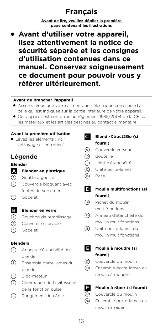 O Assurez-vous que votre alimentation électrique correspond à celle qui est indiquée sur la partie inférieure de votre appareil. O Cet appareil est conforme au règlement 1935/2004 de la CE sur les matériaux et les articles destinés au contact alimentaire. Avant la première utilisation O Lavez les éléments : voir ‘Nettoyage et entretien’.