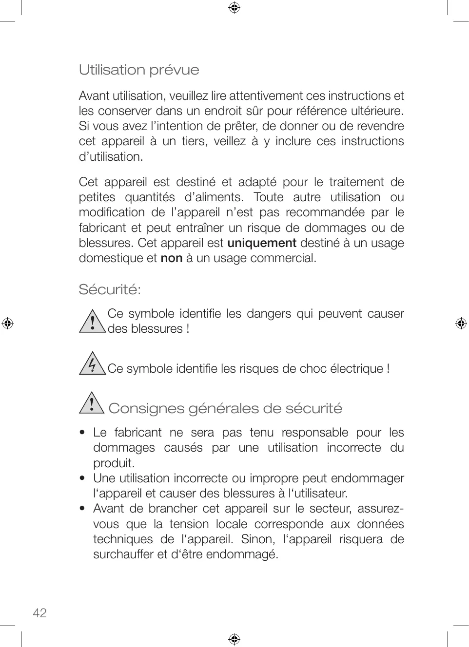 Utilisation prévue Avant utilisation, veuillez lire attentivement ces instructions et les conserver dans un endroit sûr pour référence ultérieure. Si vous avez l’intention de prêter, de donner ou de revendre cet appareil à un tiers, veillez à y inclure ces instructions d’utilisation. Cet appareil est destiné et adapté pour le traitement de petites quantités d’aliments. Toute autre utilisation ou modification de l’appareil n’est pas recommandée par le fabricant et peut entraîner un risque de dommages ou de blessures. Cet appareil est uniquement destiné à un usage domestique et non à un usage commercial. Sécurité: Ce symbole identifie les dangers qui peuvent causer des blessures ! Ce symbole identifie les risques de choc électrique ! Consignes générales de sécurité