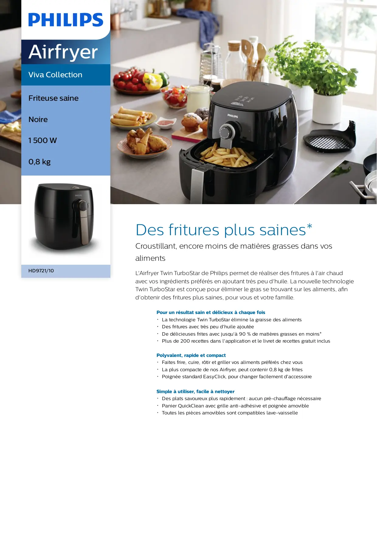 Des fritures plus saines* Croustillant, encore moins de matières grasses dans vos aliments HD 2/10) L'Airfryer Twin TurboStar de Philips permet de réaliser des fritures à l'air chaud avec vos ingrédients préférés en ajoutant très peu d'huile. La nouvelle technologie Twin TurboStar est conçue pour éliminer le gras se trouvant sur les aliments, afin d'obtenir des fritures plus saines, pour vous et votre famille. Pour un résultat sain et délicieux à chaque fois +_ La technologie Twin TurboStar élimine la graisse des aliments + Des fritures avec très peu d'huile ajoutée + De délicieuses frites avec jusqu'à 90 % de matières grasses en moins* + Plus de 200 recettes dans l'application et Le livret de recettes gratuit inclus Polyvalent, rapide et compact + Faites frire, cuire, rôtir et griller vos aliments préférés chez vous + La plus compacte de nos Airfyer, peut contenir 0.8 kg de frites + Poignée standard EasyClick, pour changer facilement d'accessoire Simple à utiliser, facile à nettoyer + Des plats savoureux plus rapidement : aucun pré-chauffage nécessaire + Panier QuickClean avec grille anti-adhésive et poignée amovible + Toutes les pièces amovibles sont compatibles lave-vaisselle