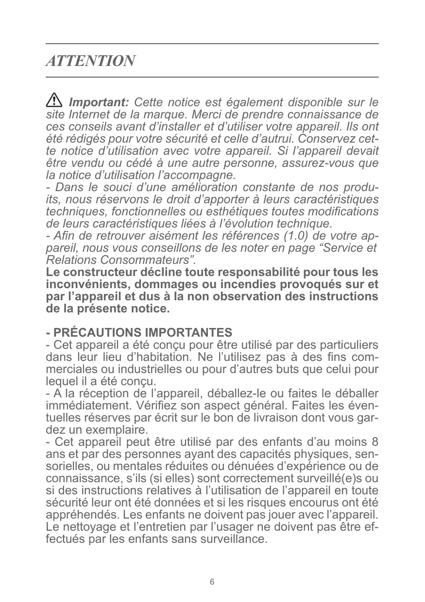 ATTENTION Important: Cette notice est également disponible sur le site Internet de la marque. Merci de prendre connaissance de ces conseils avant d’installer et d’utiliser votre appareil. Ils ont été rédigés pour votre sécurité et celle d’autrui. Conservez cette notice d’utilisation avec votre appareil. Si l’appareil devait être vendu ou cédé à une autre personne, assurez-vous que la notice d’utilisation l’accompagne. - Dans le souci d’une amélioration constante de nos produits, nous réservons le droit d’apporter à leurs caractéristiques techniques, fonctionnelles ou esthétiques toutes modifications de leurs caractéristiques liées à l’évolution technique. - Afin de retrouver aisément les références (1.0) de votre appareil, nous vous conseillons de les noter en page “Service et Relations Consommateurs”. Le constructeur décline toute responsabilité pour tous les inconvénients, dommages ou incendies provoqués sur et par l’appareil et dus à la non observation des instructions de la présente notice. - PRÉCAUTIONS IMPORTANTES - Cet appareil a été conçu pour être utilisé par des particuliers dans leur lieu d’habitation. Ne l’utilisez pas à des fins commerciales ou industrielles ou pour d’autres buts que celui pour lequel il a été conçu. - A la réception de l’appareil, déballez-le ou faites le déballer immédiatement. Vérifiez son aspect général. Faites les éventuelles réserves par écrit sur le bon de livraison dont vous gardez un exemplaire. - Cet appareil peut être utilisé par des enfants d’au moins 8 ans et par des personnes ayant des capacités physiques, sensorielles, ou mentales réduites ou dénuées d’expérience ou de connaissance, s’ils (si elles) sont correctement surveillé(e)s ou si des instructions relatives à l’utilisation de l’appareil en toute sécurité leur ont été données et si les risques encourus ont été appréhendés. Les enfants ne doivent pas jouer avec l’appareil. Le nettoyage et l’entretien par l’usager ne doivent pas être effectués par les enfants sans surveillance. 6