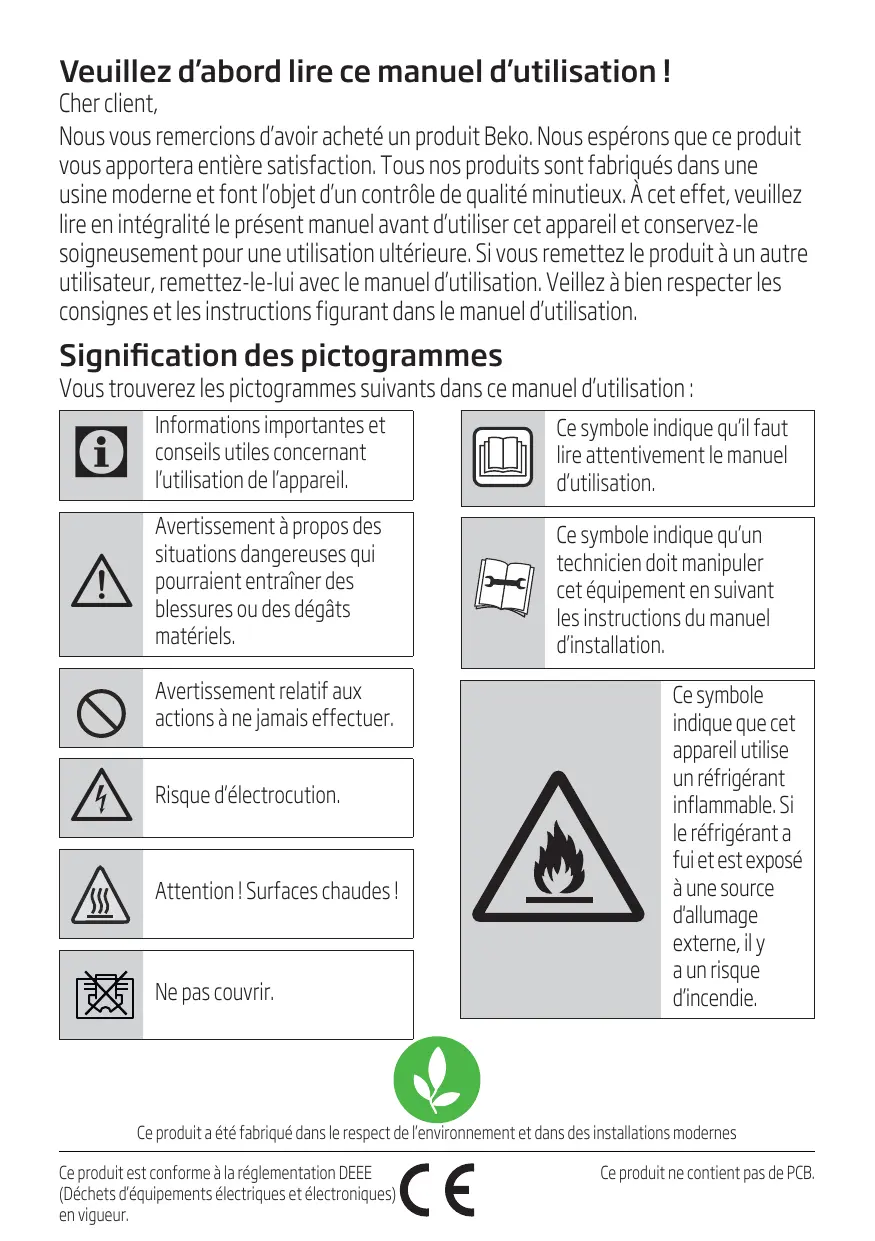 Veuillez d’abord lire ce manuel d’utilisation ! Cher client, Nous vous remercions d’avoir acheté un produit Beko. Nous espérons que ce produit vous apportera entière satisfaction. Tous nos produits sont fabriqués dans une usine moderne et font l’objet d’un contrôle de qualité minutieux. À cet effet, veuillez lire en intégralité le présent manuel avant d’utiliser cet appareil et conservez-le soigneusement pour une utilisation ultérieure. Si vous remettez le produit à un autre utilisateur, remettez-le-lui avec le manuel d’utilisation. Veillez à bien respecter les consignes et les instructions figurant dans le manuel d’utilisation.