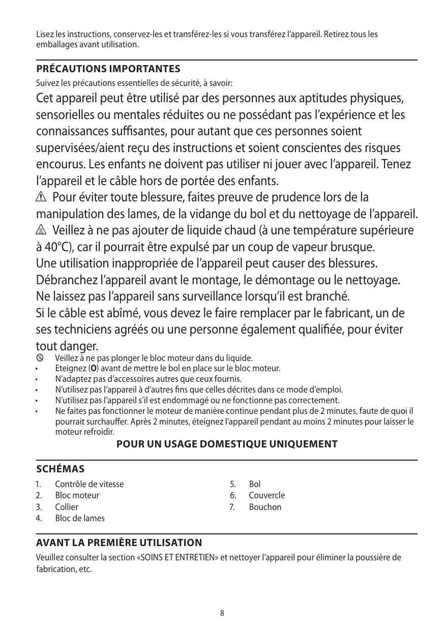 Cet appareil peut être utilisé par des personnes aux aptitudes physiques, sensorielles ou mentales réduites ou ne possédant pas l’expérience et les connaissances suffisantes, pour autant que ces personnes soient supervisées/aient reçu des instructions et soient conscientes des risques encourus. Les enfants ne doivent pas utiliser ni jouer avec l’appareil. Tenez l’appareil et le câble hors de portée des enfants. c Pour éviter toute blessure, faites preuve de prudence lors de la manipulation des lames, de la vidange du bol et du nettoyage de l’appareil. h Veillez à ne pas ajouter de liquide chaud (à une température supérieure à 40°C), car il pourrait être expulsé par un coup de vapeur brusque. Une utilisation inappropriée de l’appareil peut causer des blessures. Débranchez l’appareil avant le montage, le démontage ou le nettoyage. Ne laissez pas l’appareil sans surveillance lorsqu’il est branché. Si le câble est abîmé, vous devez le faire remplacer par le fabricant, un de ses techniciens agréés ou une personne également qualifiée, pour éviter tout danger.