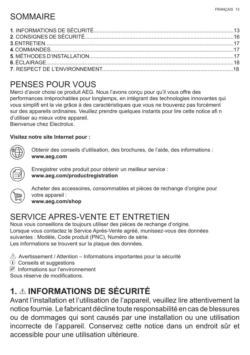 Merci d’avoir choisi ce produit AEG. Nous l’avons conçu pour qu’il vous offre des performances irréprochables pour longtemps, en intégrant des technologies innovantes qui vous simplifi ent la vie grâce à des caractéristiques que vous ne trouverez pas forcément sur des appareils ordinaires. Veuillez prendre quelques instants pour lire cette notice afi n d’utiliser au mieux votre appareil. Bienvenue chez Electrolux. Visitez notre site Internet pour : Obtenir des conseils d’utilisation, des brochures, de l’aide, des informations : www.aeg.com Enregistrer votre produit pour obtenir un meilleur service : www.aeg.com/productregistration Acheter des accessoires, consommables et pièces de rechange d’origine pour votre appareil : www.aeg.com/shop Nous vous conseillons de toujours utiliser des pièces de rechange d’origine. Lorsque vous contactez le Service Après-Vente agréé, munissez-vous des données suivantes : Modèle, Code produit (PNC), Numéro de série. Les informations se trouvent sur la plaque des données. Avertissement / Attention – Informations importantes pour la sécurité Conseils et suggestions Informations sur l’environnement Sous réserve de modifications.