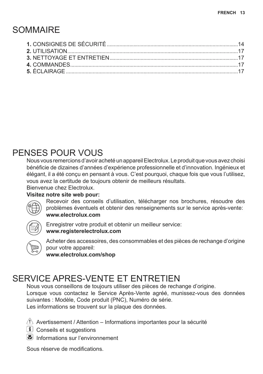 Nous vous remercions d’avoir acheté un appareil Electrolux. Le produit que vous avez choisi bénéficie de dizaines d’années d’expérience professionnelle et d’innovation. Ingénieux et élégant, il a été conçu en pensant à vous. C’est pourquoi, chaque fois que vous l’utilisez, vous avez la certitude de toujours obtenir de meilleurs résultats. Bienvenue chez Electrolux. Visitez notre site web pour: Recevoir des conseils d’utilisation, télécharger nos brochures, résoudre des problèmes éventuels et obtenir des renseignements sur le service après-vente: www.electrolux.com Enregistrer votre produit et obtenir un meilleur service: www.registerelectrolux.com Acheter des accessoires, des consommables et des pièces de rechange d’origine pour votre appareil: www.electrolux.com/shop