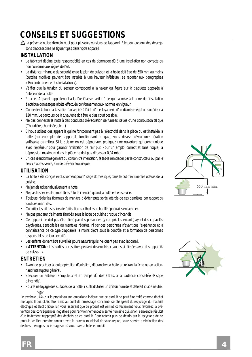 • Avant de procéder à toute opération d’entretien, débrancher la hotte en retirant la fiche ou en actionnant l’interrupteur général. • Effectuer un entretien scrupuleux et en temps dû des Filtres, à la cadence conseillée (Risque d’incendie). • Pour le nettoyage des surfaces de la hotte, il suffit d’utiliser un chiffon humide et détersif liquide neutre. Le symbole sur le produit ou son emballage indique que ce produit ne peut être traité comme déchet ménager. Il doit plutôt être remis au point de ramassage concerné, se chargeant du recyclage du matériel électrique et électronique. En vous assurant que ce produit est éliminé correctement, vous favorisez la prévention des conséquences négatives pour l’environnement et la santé humaine qui, sinon, seraient le résultat d’un traitement inapproprié des déchets de ce produit. Pour obtenir plus de détails sur le recyclage de ce produit, veuillez prendre contact avec le bureau municipal de votre région, votre service d’élimination des déchets ménagers ou le magasin où vous avez acheté le produit.