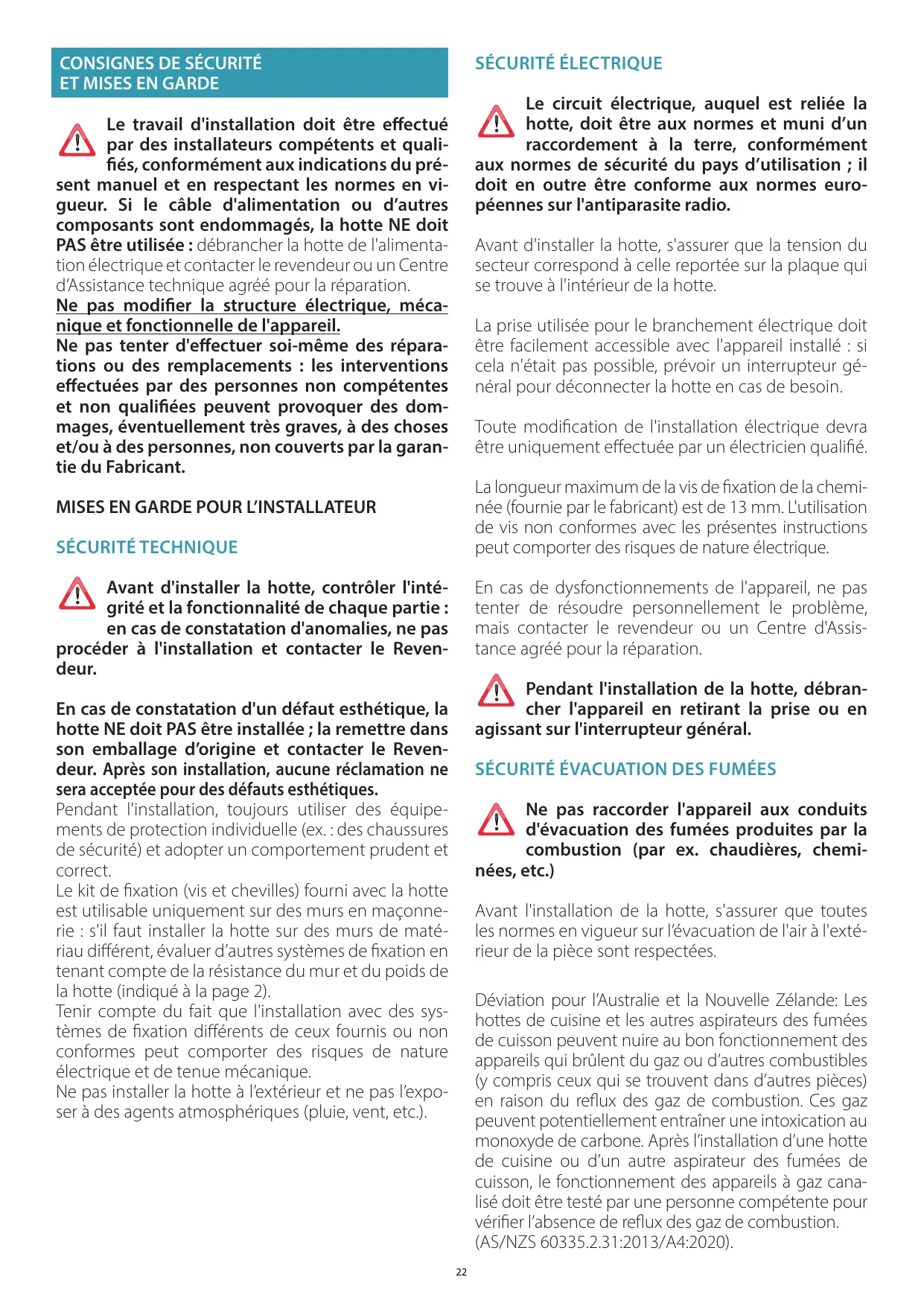 Avant l'installation de la hotte, s'assurer que toutes les normes en vigueur sur l’évacuation de l'air à l'extérieur de la pièce sont respectées. Déviation pour l’Australie et la Nouvelle Zélande: Les hottes de cuisine et les autres aspirateurs des fumées de cuisson peuvent nuire au bon fonctionnement des appareils qui brûlent du gaz ou d’autres combustibles (y compris ceux qui se trouvent dans d’autres pièces) en raison du reflux des gaz de combustion. Ces gaz peuvent potentiellement entraîner une intoxication au monoxyde de carbone. Après l’installation d’une hotte de cuisine ou d’un autre aspirateur des fumées de cuisson, le fonctionnement des appareils à gaz canalisé doit être testé par une personne compétente pour vérifier l’absence de reflux des gaz de combustion. (AS/NZS 60335.2.31:2013/A4:2020). 22