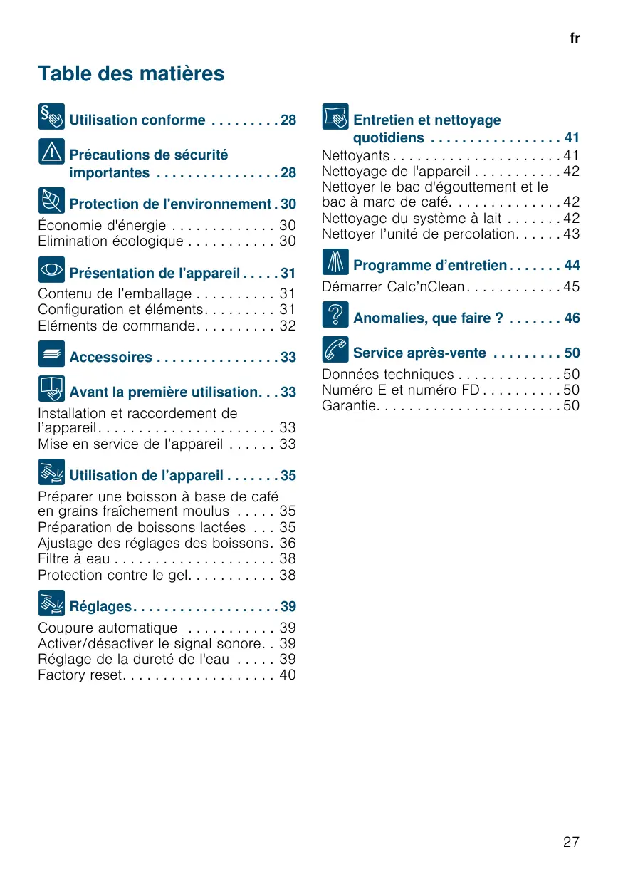 Réglages. . . . . . . . . . . . . . . . . . . 39 Coupure automatique . . . . . . . . . . . 39 Activer/désactiver le signal sonore. . 39 Réglage de la dureté de l'eau . . . . . 39 Factory reset. . . . . . . . . . . . . . . . . . . 40