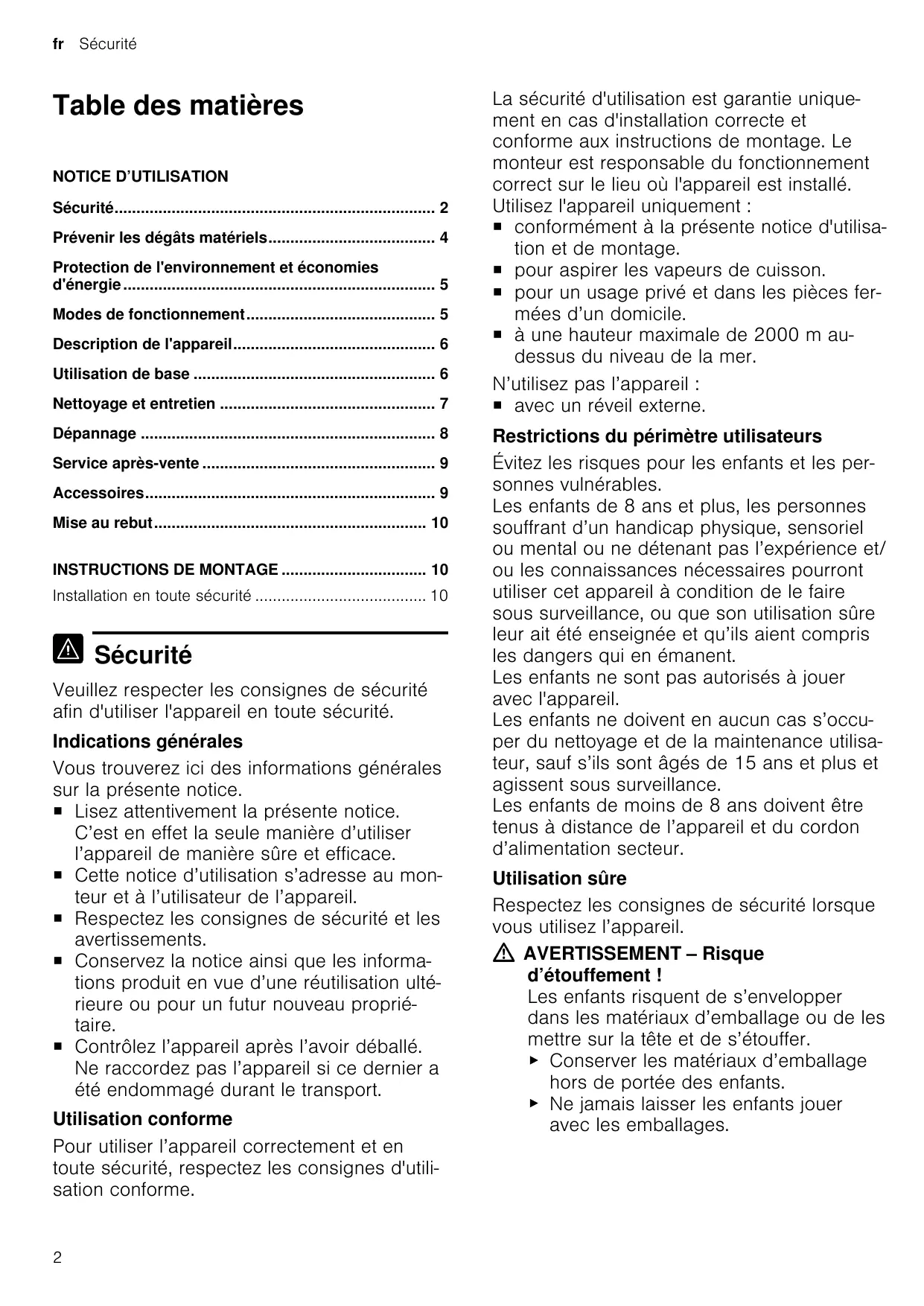 La sécurité d'utilisation est garantie uniquement en cas d'installation correcte et conforme aux instructions de montage. Le monteur est responsable du fonctionnement correct sur le lieu où l'appareil est installé. Utilisez l'appareil uniquement : ¡ conformément à la présente notice d'utilisation et de montage. ¡ pour aspirer les vapeurs de cuisson. ¡ pour un usage privé et dans les pièces fermées d’un domicile. ¡ à une hauteur maximale de 2000 m audessus du niveau de la mer. N’utilisez pas l’appareil : ¡ avec un réveil externe. Restrictions du périmètre utilisateurs Évitez les risques pour les enfants et les personnes vulnérables. Les enfants de 8 ans et plus, les personnes souffrant d’un handicap physique, sensoriel ou mental ou ne détenant pas l’expérience et/ ou les connaissances nécessaires pourront utiliser cet appareil à condition de le faire sous surveillance, ou que son utilisation sûre leur ait été enseignée et qu’ils aient compris les dangers qui en émanent. Les enfants ne sont pas autorisés à jouer avec l'appareil. Les enfants ne doivent en aucun cas s’occuper du nettoyage et de la maintenance utilisateur, sauf s’ils sont âgés de 15 ans et plus et agissent sous surveillance. Les enfants de moins de 8 ans doivent être tenus à distance de l’appareil et du cordon d’alimentation secteur. Utilisation sûre Respectez les consignes de sécurité lorsque vous utilisez l’appareil. AVERTISSEMENT ‒ Risque d’étouffement ! Les enfants risquent de s’envelopper dans les matériaux d’emballage ou de les mettre sur la tête et de s’étouffer. ▶ Conserver les matériaux d’emballage hors de portée des enfants. ▶ Ne jamais laisser les enfants jouer avec les emballages.
