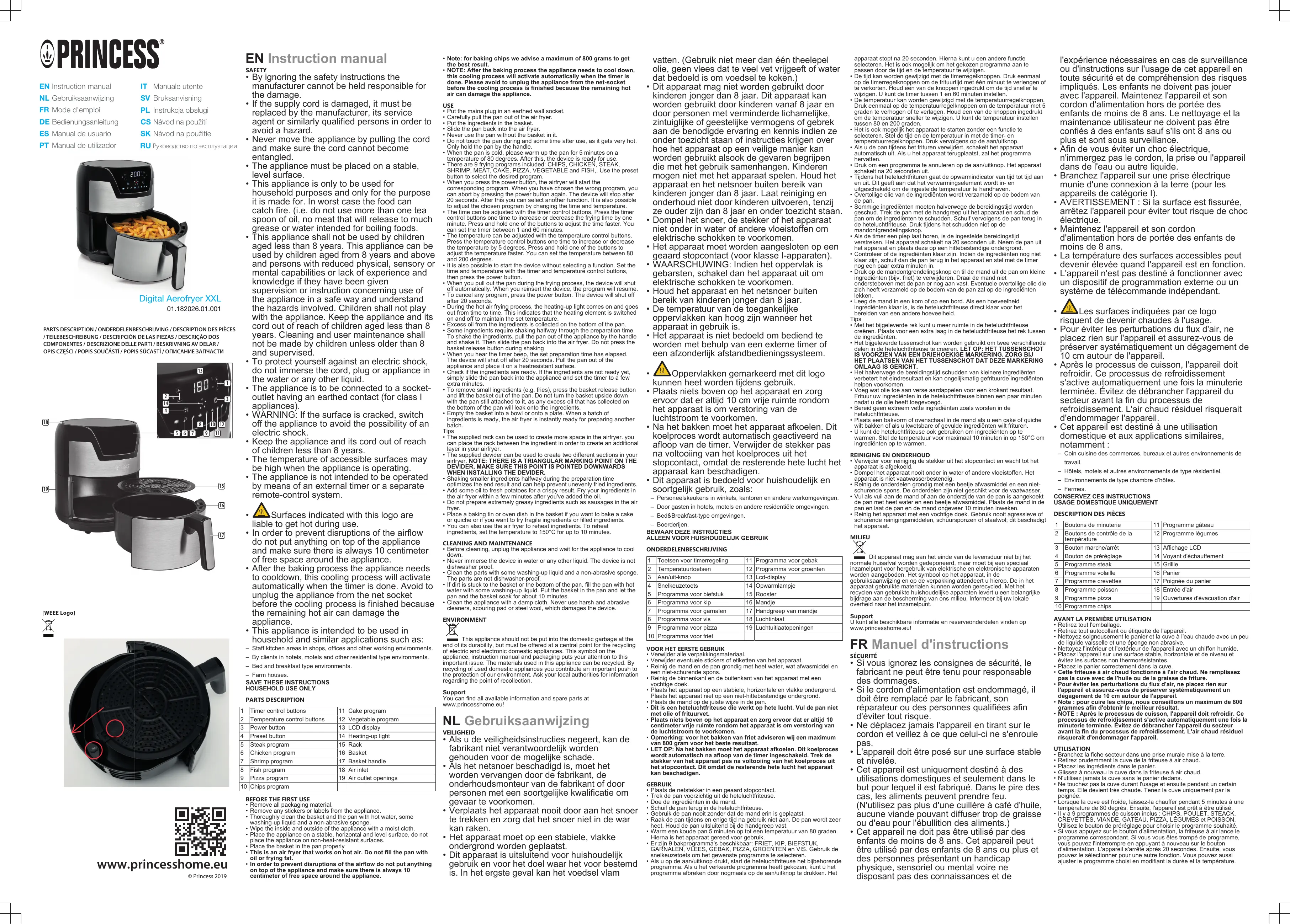 • La durée est réglable avec les boutons de minuterie. Appuyez sur les boutons de minuterie une fois pour augmenter /réduire le temps de friture d'une minute. Appuyez sur l'un des boutons sans le relâcher pour accélérer le réglage de la durée. La minuterie est réglable entre 1 et 60 minutes. • La température est réglable avec les boutons de thermostat. Appuyez sur les boutons de température une fois pour augmenter /réduire la température de 5 degrés. Appuyez sur l'un des boutons sans le relâcher pour accélérer le réglage de température. La température est réglable entre 80 et 200 degrés. • Vous pouvez aussi démarrer l'appareil sans sélectionner une fonction. Réglez la durée et la température avec les boutons de minuterie et de thermostat puis appuyez sur le bouton d'alimentation. • Si vous retirez la cuve durant le processus de friture, l'appareil s'éteint automatiquement. Lorsque vous remettez l'appareil, le programme reprend. • Pour annuler un programme, appuyez sur le bouton d'alimentation. L'appareil s'éteint après 20 secondes. • Durant le processus de friture à l'air chaud, le témoin de chauffage s'allume et s'éteint de temps à autre. C'est l'indication que l'élément chauffant s'allume et s'éteint pour entretenir la température. • L'excès d'huile des ingrédients est recueilli au fond de la cuve. • Certains ingrédients ont besoin d'être secoués à mi-temps de la préparation Pour secouer les ingrédients, sortez la cuve de l'appareil par la poignée et secouez-la. Puis glissez à nouveau la cuve dans la friteuse à air chaud. N'appuyez pas sur le bouton de libération de panier durant la secousse. • Dès que le minuteur sonne, le temps de préparation réglé s'est écoulé. L'appareil s'éteint après 20 secondes. Sortez la cuve de l'appareil et placez-la sur une surface thermorésistante. • Vérifiez si les ingrédients sont prêts. Si les ingrédients ne sont pas encore prêts, glissez simplement à nouveau la cuve dans l'appareil et ajoutez quelques minutes au minuteur. • Pour retirer les petits ingrédients (ex. frites), appuyez sur le bouton de libération de panier et sortez le panier de la cuve. Ne retournez pas le panier avec la cuve encore fixée dessus. En effet, tout l'excès d'huile recueilli au fond de la cuve risque de couler sur les ingrédients. • Videz le panier sur un plat ou dans un bol. Dès qu'un lot d'ingrédients est prêt, la friteuse à air chaud est prête instantanément pour la préparation du lot suivant. Conseils • L'étagère fournie peut servir à augmenter l'espace dans la friteuse à air. Vous pouvez placer l'étagère entre les ingrédients afin de créer un étag additionnel dans votre friteuse à air. • Le diviseur fourni peut servir à créer deux sections différentes dans votre friteuse à air. NOTE : LE DIVISEUR COMPORTE UN POINT DE REPÈRE TRIANGULAIRE. ASSUREZ-VOUS QUE CE POINT EST DIRIGÉ VERS LE BAS EN INSTALLANT LE DIVISEUR. • Secouer les petits ingrédients à mi-temps durant la préparation optimise le résultat final et contribue à éviter la friture irrégulière des ingrédients. • Ajoutez de l'huile aux pommes de terre fraîches pour un résultat croustillant. Faites frire vos ingrédients dans la friteuse à air chaud en quelques minutes après avoir ajouté de l'huile. • Évitez de préparer des ingrédients très graisseux comme les saucisses dans la friteuse à air chaud. • Placez un moule de cuisson ou pour le four dans le panier afin de cuire un gâteau ou une quiche, voire pour frire des ingrédients fragiles ou farcis. • Vous pouvez aussi utiliser la friteuse à air chaud pour réchauffer des ingrédients. Pour réchauffer les ingrédients, réglez la température sur 150°C pendant un maximum de 10 minutes. NETTOYAGE ET MAINTENANCE • Avant le nettoyage, débranchez l'appareil et attendez qu'il refroidisse. • N'immergez pas l'appareil dans de l'eau ou dans d'autres liquides. L'appareil ne sont pas lavables au lave-vaisselle. • Nettoyez les pièces à l'eau chaude avec un peu de liquide vaisselle et une éponge non abrasive. Les pièces ne sont pas lavables au lavevaisselle. • Si de la saleté adhère au panier ou au fond de la cuve, remplissez la cuve d'eau chaude avec un peu de liquide vaisselle. Placez le panier dans la cuve et laissez le panier et la cuve tremper environ 10 minutes. • Nettoyez l'appareil avec un chiffon humide. N'utilisez pas de produits nettoyants agressifs ou abrasifs, de tampons à récurer ou de laine de verre, ceux-ci pourraient endommager l'appareil. ENVIRONNEMENT Cet appareil ne doit pas être jeté avec les déchets ménagers à la fin de sa durée de vie, il doit être remis à un centre de recyclage pour les appareils électriques et électroniques. Ce symbole sur l'appareil, le manuel d'utilisation et l'emballage attire votre attention sur un point important. Les matériaux utilisés dans cet appareil sont recyclables. En recyclant vos appareils, vous contribuez de manière significative à la protection de notre environnement. Renseignez-vous auprès des autorités locales pour connaître les centres de collecte des déchets. Support Vous retrouvez toutes les informations et pièces de rechange sur www.princesshome.eu !