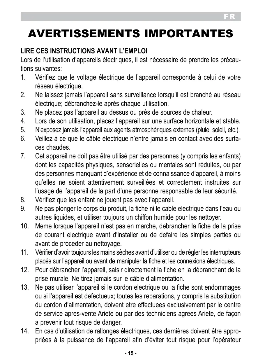 AVERTISSEMENTS IMPORTANTES LIRE CES INSTRUCTIONS AVANT L’EMPLOI Lors de l’utilisation d’appareils électriques, il est nécessaire de prendre les précautions suivantes: 1. Vérifiez que le voltage électrique de l’appareil corresponde à celui de votre réseau électrique. 2. Ne laissez jamais l’appareil sans surveillance lorsqu’il est branché au réseau électrique; débranchez-le après chaque utilisation. 3. Ne placez pas l’appareil au dessus ou près de sources de chaleur. 4. Lors de son utilisation, placez l’appareil sur une surface horizontale et stable. 5. N’exposez jamais l’appareil aux agents atmosphériques externes (pluie, soleil, etc.). 6. Veillez à ce que le câble électrique n’entre jamais en contact avec des surfaces chaudes. 7. Cet appareil ne doit pas être utilisé par des personnes (y compris les enfants) dont les capacités physiques, sensorielles ou mentales sont réduites, ou par des personnes manquant d’expérience et de connaissance d’appareil, à moins qu’elles ne soient attentivement surveillées et correctement instruites sur l’usage de l’appareil de la part d’une personne responsable de leur sécurité. 8. Vérifiez que les enfant ne jouent pas avec l’appareil. 9. Ne pas plonger le corps du produit, la fiche ni le cable electrique dans l’eau ou autres liquides, et utiliser toujours un chiffon humide pour les nettoyer. 10. Meme lorsque l’appareil n’est pas en marche, debrancher la fiche de la prise de courant electrique avant d’installer ou de defaire les simples parties ou avant de proceder au nettoyage. 11. Vérifier d’avoir toujours les mains sèches avant d’utiliser ou de régler les interrupteurs placés sur l’appareil ou avant de manipuler la fiche et les connexions électriques. 12. Pour débrancher l’appareil, saisir directement la fiche en la débranchant de la prise murale. Ne tirez jamais sur le câble d’alimentation. 13. Ne pas utiliser l’appareil si le cordon electrique ou la fiche sont endommages ou si l’appareil est defectueux; toutes les reparations, y compris la substitution du cordon d’alimentation, doivent etre effectuees exclusivement par le centre de service apres-vente Ariete ou par des techniciens agrees Ariete, de façon a prevenir tout risque de danger. 14. En cas d’utilisation de rallonges électriques, ces dernières doivent être appropriées à la puissance de l’appareil afin d’éviter tout risque pour l’opérateur - 15 -