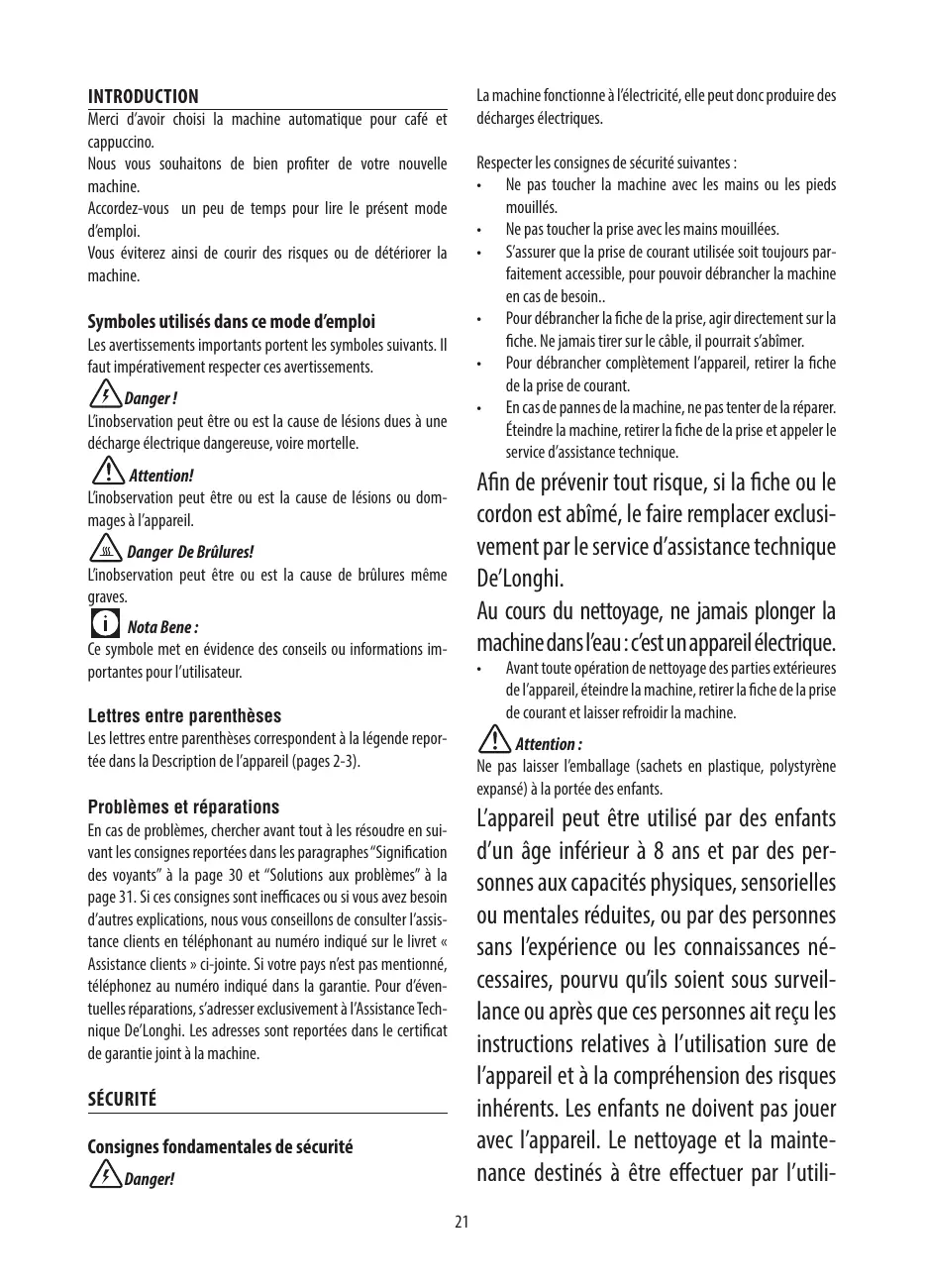 Lettres entre parenthèses Les lettres entre parenthèses correspondent à la légende reportée dans la Description de l’appareil (pages 2-3). Avant toute opération de nettoyage des parties extérieures de l’appareil, éteindre la machine, retirer la fiche de la prise de courant et laisser refroidir la machine. Attention : Ne pas laisser l’emballage (sachets en plastique, polystyrène expansé) à la portée des enfants. Problèmes et réparations En cas de problèmes, chercher avant tout à les résoudre en suivant les consignes reportées dans les paragraphes “Signification des voyants” à la page 30 et “Solutions aux problèmes” à la page 31. Si ces consignes sont inefficaces ou si vous avez besoin d’autres explications, nous vous conseillons de consulter l’assistance clients en téléphonant au numéro indiqué sur le livret « Assistance clients » ci-jointe. Si votre pays n’est pas mentionné, téléphonez au numéro indiqué dans la garantie. Pour d’éventuelles réparations, s’adresser exclusivement à l’Assistance Technique De’Longhi. Les adresses sont reportées dans le certificat de garantie joint à la machine. L’appareil peut être utilisé par des enfants d’un âge inférieur à 8 ans et par des personnes aux capacités physiques, sensorielles ou mentales réduites, ou par des personnes sans l’expérience ou les connaissances nécessaires, pourvu qu’ils soient sous surveillance ou après que ces personnes ait reçu les instructions relatives à l’utilisation sure de l’appareil et à la compréhension des risques inhérents. Les enfants ne doivent pas jouer avec l’appareil. Le nettoyage et la maintenance destinés à être effectuer par l’utili- SÉCURITÉ Consignes fondamentales de sécurité Danger!