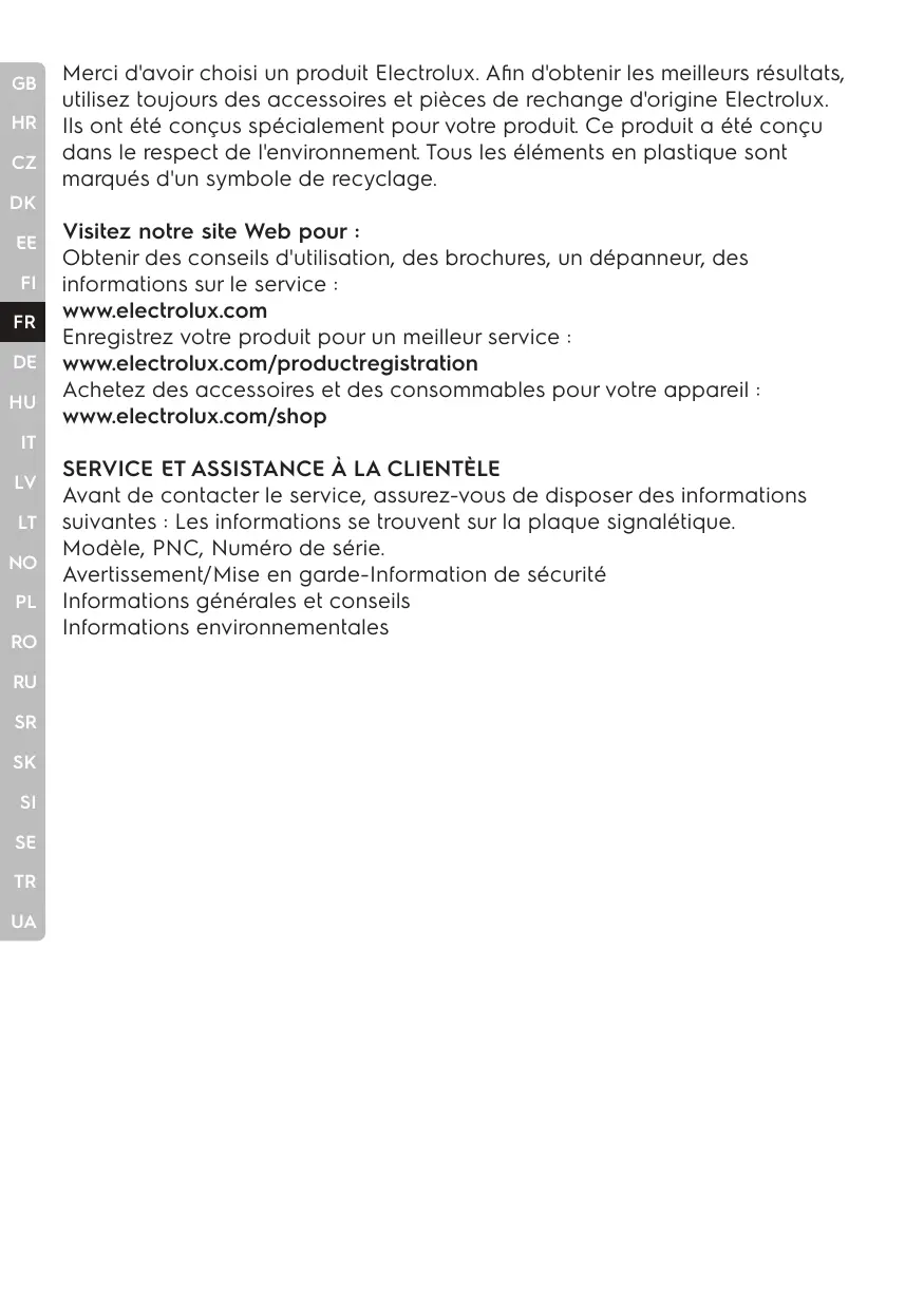 IT LV LT NO PL RO RU SR SK SI SE TR UA SERVICE ET ASSISTANCE À LA CLIENTÈLE Avant de contacter le service, assurez-vous de disposer des informations suivantes : Les informations se trouvent sur la plaque signalétique.