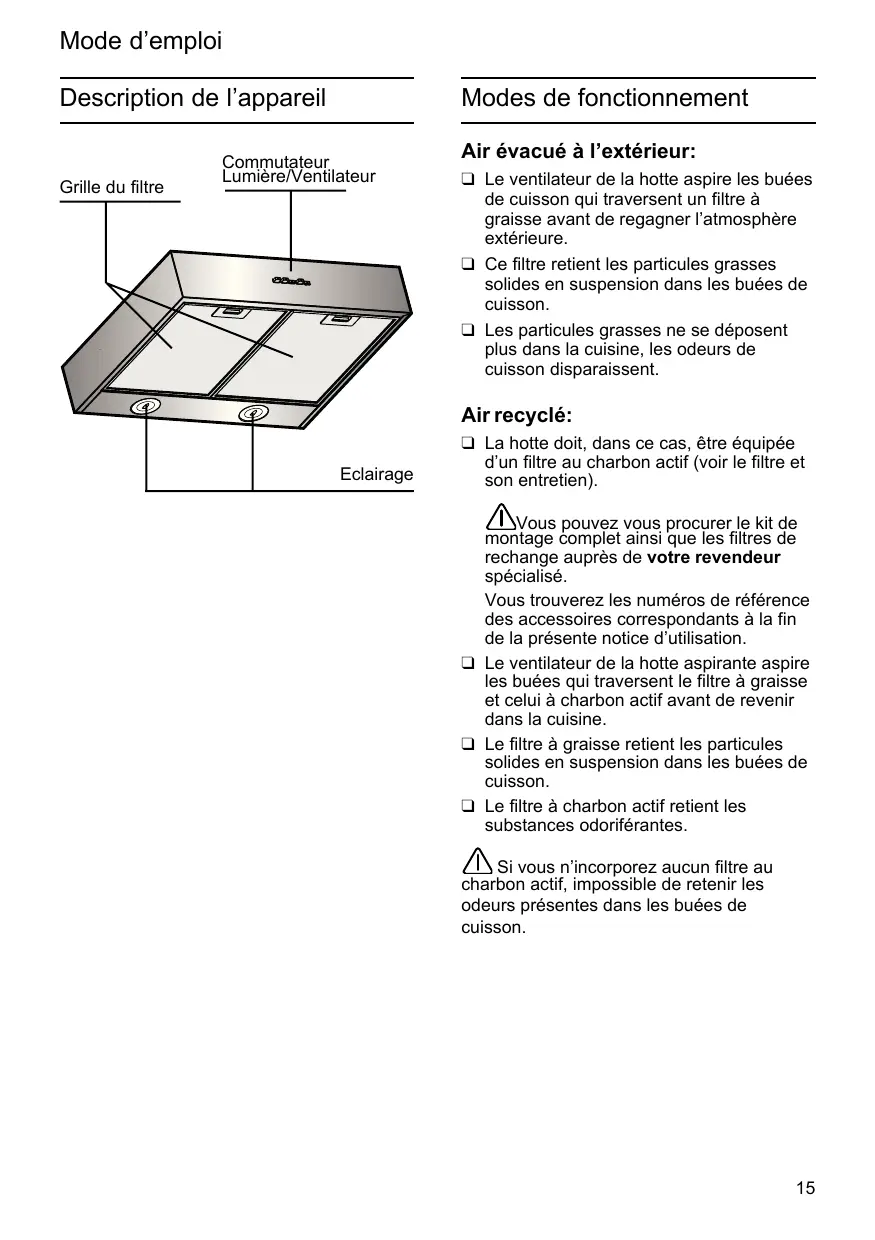 Vous pouvez vous procurer le kit de montage complet ainsi que les filtres de rechange auprès de votre revendeur spécialisé. Vous trouverez les numéros de référence des accessoires correspondants à la fin de la présente notice d’utilisation. ❑ Le ventilateur de la hotte aspirante aspire les buées qui traversent le filtre à graisse et celui à charbon actif avant de revenir dans la cuisine. ❑ Le filtre à graisse retient les particules solides en suspension dans les buées de cuisson. ❑ Le filtre à charbon actif retient les substances odoriférantes. Si vous n’incorporez aucun filtre au charbon actif, impossible de retenir les odeurs présentes dans les buées de cuisson.