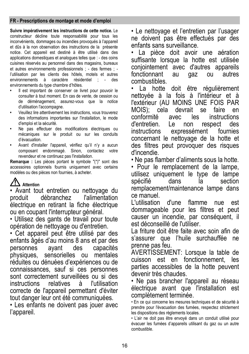 • La pièce doit avoir une aération suffisante lorsque la hotte est utilisée conjointement avec d'autres appareils fonctionnant au gaz ou autres combustibles. • La hotte doit être régulièrement nettoyée à la fois à l'intérieur et à l'extérieur (AU MOINS UNE FOIS PAR MOIS); cela devrait se faire en conformité avec les instructions d'entretien. Le non respect des instructions expressément fournies concernant le nettoyage de la hotte et des filtres peut provoquer des risques d'incendie. • Ne pas flamber d’aliments sous la hotte. • Pour le remplacement de la lampe, utilisez uniquement le type de lampe spécifié dans la section remplacement/maintenance lampe dans ce manuel. L'utilisation d'une flamme nue est dommageable pour les filtres et peut causer un incendie, par conséquent, il est déconseillé de l'utiliser. La friture doit être faite avec soin afin de s’assurer que l’huile surchauffée ne prenne pas feu. AVERTISSEMENT: Lorsque la table de cuisson est en fonctionnement, les parties accessibles de la hotte peuvent devenir très chaudes. • Ne pas brancher l'appareil au réseau électrique avant que l'installation est complètement terminée.