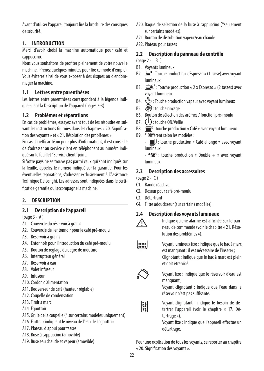 Description de l’appareil (page 3 - A ) A1. Couvercle du réservoir à grains A2. Couvercle de l'entonnoir pour le café pré-moulu A3. Réservoir à grains A4. Entonnoir pour l’introduction du café pré-moulu A5. Bouton de réglage du degré de mouture A6. Interrupteur général A7. Réservoir à eau A8. Volet infuseur A9. Infuseur A10. Cordon d’alimentation A11. Bec verseur de café (hauteur réglable) A12. Coupelle de condensation A13. Tiroir à marc A14. Égouttoir A15. Grille de la coupelle (* sur certains modèles uniquement) A16. Flotteur indiquant le niveau de l'eau de l'égouttoir A17. Plateau d'appui pour tasses A18. Buse à cappuccino (amovible) A19. Buse eau chaude et vapeur (amovible) Indique qu’une alarme est affichée sur le panneau de commande (voir le chapitre « 21. Résolution des problèmes »). Voyant lumineux fixe : indique que le bac à marc est manquant : il est nécessaire de l'insérer ; Clignotant : indique que le bac à marc est plein et doit être vidé. Voyant fixe : indique que le réservoir d'eau est manquant ; Voyant clignotant : indique que l'eau dans le réservoir n'est pas suffisante. Voyant clignotant : indique le besoin de détartrer l'appareil (voir le chapitre « 17. Détartrage »). Voyant fixe : indique que l'appareil effectue un détartrage. Pour une explication de tous les voyants, se reporter au chapitre « 20. Signification des voyants ».