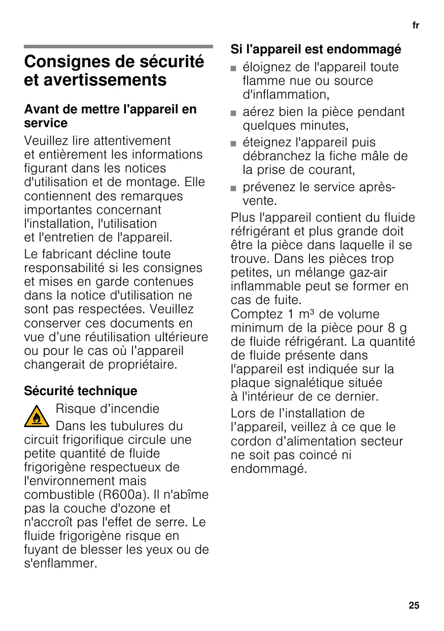 frTable des matièresfrNotice d’utilsationCombiné réfrigérateur-congélateur Consignes de sécurité et avertissements Avant de mettre l'appareil en service Veuillez lire attentivement et entièrement les informations figurant dans les notices d'utilisation et de montage. Elle contiennent des remarques importantes concernant l'installation, l'utilisation et l'entretien de l'appareil. Le fabricant décline toute responsabilité si les consignes et mises en garde contenues dans la notice d'utilisation ne sont pas respectées. Veuillez conserver ces documents en vue d’une réutilisation ultérieure ou pour le cas où l’appareil changerait de propriétaire. Sécurité technique Risque d’incendie Dans les tubulures du circuit frigorifique circule une petite quantité de fluide frigorigène respectueux de l'environnement mais combustible (R600a). Il n'abîme pas la couche d'ozone et n'accroît pas l'effet de serre. Le fluide frigorigène risque en fuyant de blesser les yeux ou de s'enflammer. Si l'appareil est endommagé ■ éloignez de l'appareil toute flamme nue ou source d'inflammation, ■ aérez bien la pièce pendant quelques minutes, ■ éteignez l'appareil puis débranchez la fiche mâle de la prise de courant, ■ prévenez le service aprèsvente. Plus l'appareil contient du fluide réfrigérant et plus grande doit être la pièce dans laquelle il se trouve. Dans les pièces trop petites, un mélange gaz-air inflammable peut se former en cas de fuite. Comptez 1 m³ de volume minimum de la pièce pour 8 g de fluide réfrigérant. La quantité de fluide présente dans l'appareil est indiquée sur la plaque signalétique située à l'intérieur de ce dernier. Lors de l’installation de l’appareil, veillez à ce que le cordon d’alimentation secteur ne soit pas coincé ni endommagé.