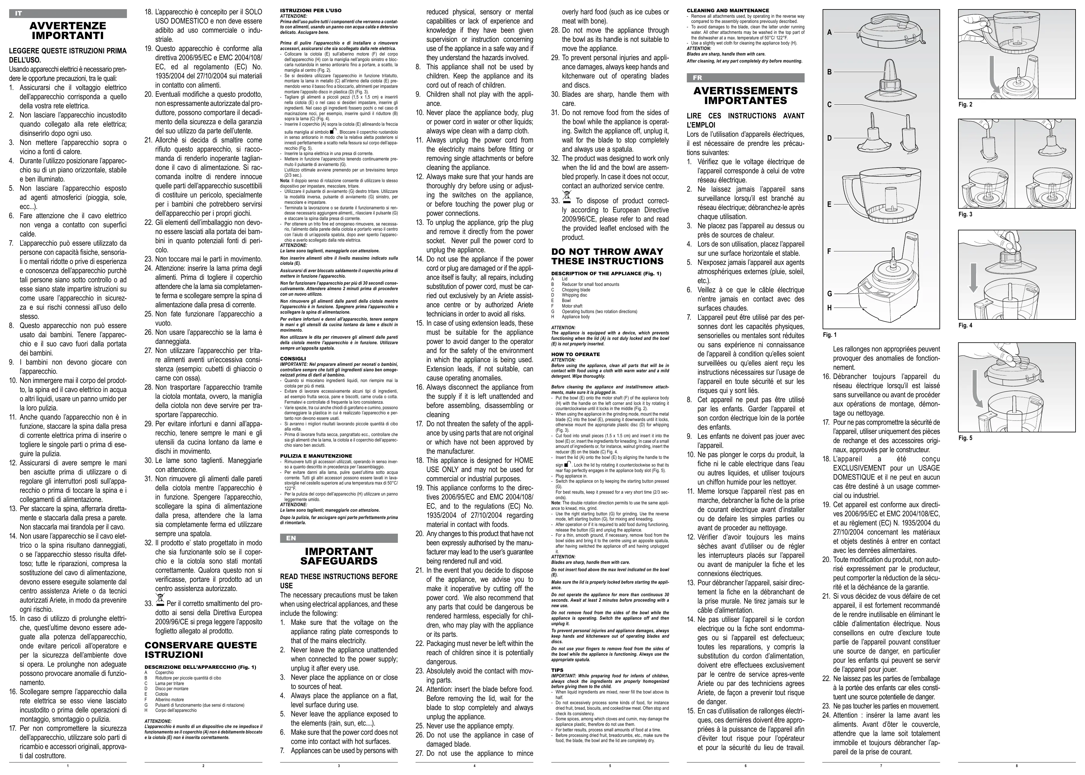 Ne pas oter les alimentes des parois du recipient quand l'appareil est en fonctionnement. Eteindre l'appareil, débrancher la prise d'alimentation du secteur, attendre que la lame soit entierement à l'arrêt et toujours utiliser une spatule.