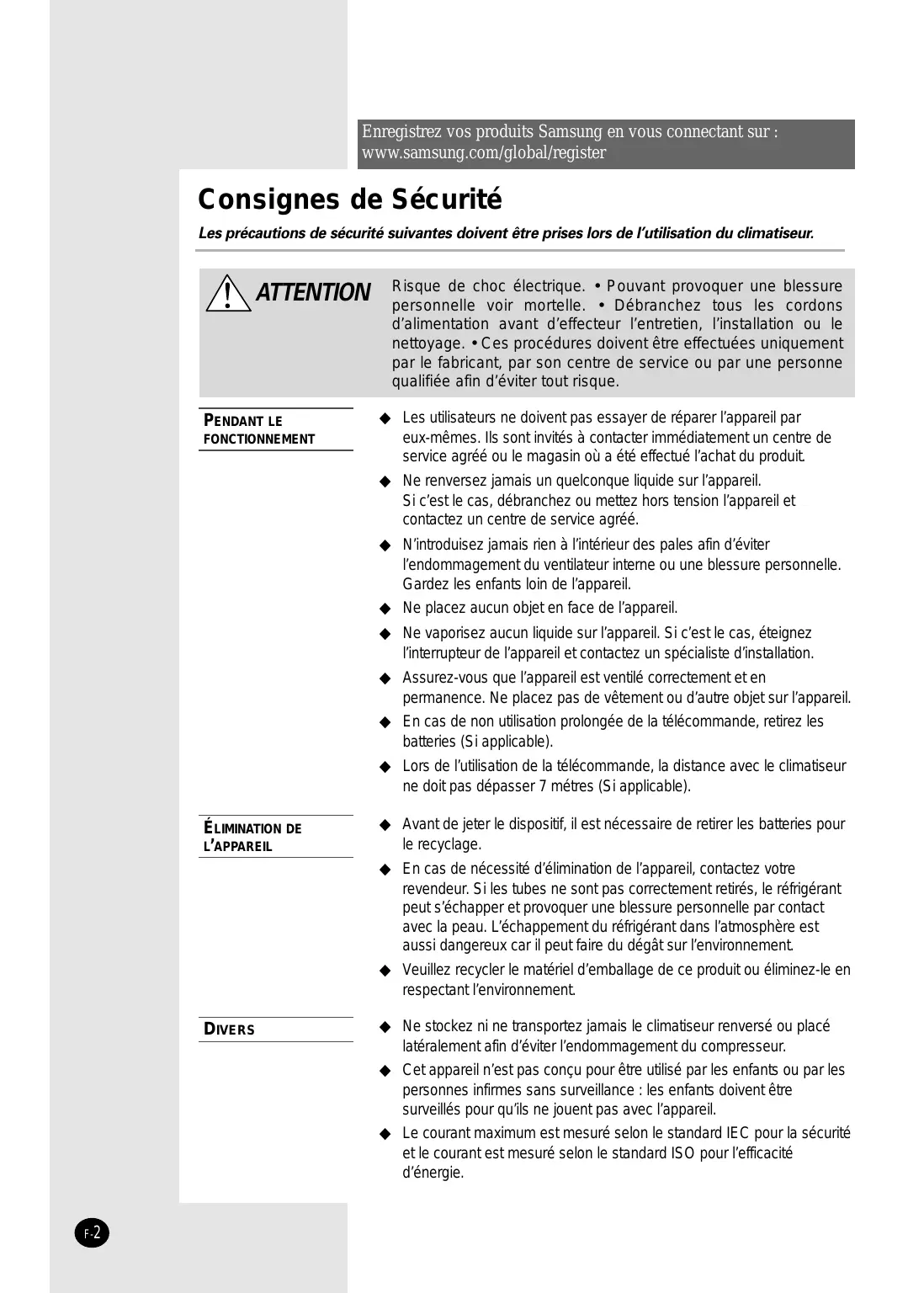 GEBRAUCHSANWEISUNG RUSSIAN E§§HNIKA åÌÓ„ÓÙÛÌ͈ËÓ̇θÌ˚È ÇÓÁ‰Û¯Ì˚È äÓ̉ˈËÓÌ ë‚Ó·Ó‰ÌÓ„Ó ëÓ‰ËÌÂÌËfl (éı·ʉÂÌËÂ Ë é·Ó„‚) E S F I P D G R DB98-20234A(6) Enregistrez vos produits Samsung en vous connectant sur : www.samsung.com/global/register Consignes de Sécurité Les précautions de sécurité suivantes doivent être prises lors de l’utilisation du climatiseur. ATTENTION PENDANT LE FONCTIONNEMENT Risque de choc électrique. • Pouvant provoquer une blessure personnelle voir mortelle. • Débranchez tous les cordons d’alimentation avant d’effecteur l’entretien, l’installation ou le nettoyage. • Ces procédures doivent être effectuées uniquement par le fabricant, par son centre de service ou par une personne qualifiée afin d’éviter tout risque. ◆ Les utilisateurs ne doivent pas essayer de réparer l’appareil par eux-mêmes. Ils sont invités à contacter immédiatement un centre de service agréé ou le magasin où a été effectué l’achat du produit. ◆ Ne renversez jamais un quelconque liquide sur l’appareil. Si c’est le cas, débranchez ou mettez hors tension l’appareil et contactez un centre de service agréé. ◆ N’introduisez jamais rien à l’intérieur des pales afin d’éviter l’endommagement du ventilateur interne ou une blessure personnelle. Gardez les enfants loin de l’appareil. ◆ Ne placez aucun objet en face de l’appareil. ◆ Ne vaporisez aucun liquide sur l’appareil. Si c’est le cas, éteignez l’interrupteur de l’appareil et contactez un spécialiste d’installation. ◆ Assurez-vous que l’appareil est ventilé correctement et en permanence. Ne placez pas de vêtement ou d’autre objet sur l’appareil. ◆ En cas de non utilisation prolongée de la télécommande, retirez les batteries (Si applicable). ◆ Lors de l’utilisation de la télécommande, la distance avec le climatiseur ne doit pas dépasser 7 métres (Si applicable). ÉLIMINATION DE L’APPAREIL ◆ Avant de jeter le dispositif, il est nécessaire de retirer les batteries pour le recyclage. ◆ En cas de nécessité d’élimination de l’appareil, contactez votre revendeur. Si les tubes ne sont pas correctement retirés, le réfrigérant peut s’échapper et provoquer une blessure personnelle par contact avec la peau. L’échappement du réfrigérant dans l’atmosphère est aussi dangereux car il peut faire du dégât sur l’environnement. ◆ Veuillez recycler le matériel d’emballage de ce produit ou éliminez-le en respectant l’environnement. DIVERS ◆ Ne stockez ni ne transportez jamais le climatiseur renversé ou placé latéralement afin d’éviter l’endommagement du compresseur. ◆ Cet appareil n’est pas conçu pour être utilisé par les enfants ou par les personnes infirmes sans surveillance : les enfants doivent être surveillés pour qu’ils ne jouent pas avec l’appareil. ◆ Le courant maximum est mesuré selon le standard IEC pour la sécurité et le courant est mesuré selon le standard ISO pour l’efficacité d’énergie. F-2 Sommaire