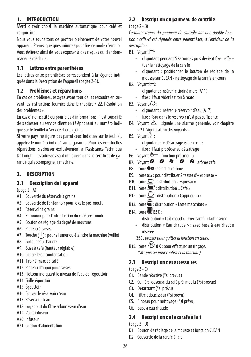 B3. Voyant : - clignotant : insérer le réservoir d’eau (A17) - fixe : l’eau dans le réservoir n’est pas suffisante B4. Voyant : signale une alarme générale, voir chapitre « 21. Signification des voyants » B5. Voyant : - clignotant : le détartrage est en cours - fixe : il faut procéder au détartrage B6. Voyant : fonction pré-moulu B7. Voyant En cas d'inefficacité ou pour plus d'informations, il est conseillé de s'adresser au service client en téléphonant au numéro indiqué sur le feuillet « Service client » joint. Si votre pays ne figure pas parmi ceux indiqués sur le feuillet, appelez le numéro indiqué sur la garantie. Pour les éventuelles réparations, s'adresser exclusivement à l'Assistance Technique De'Longhi. Les adresses sont indiquées dans le certificat de garantie qui accompagne la machine.