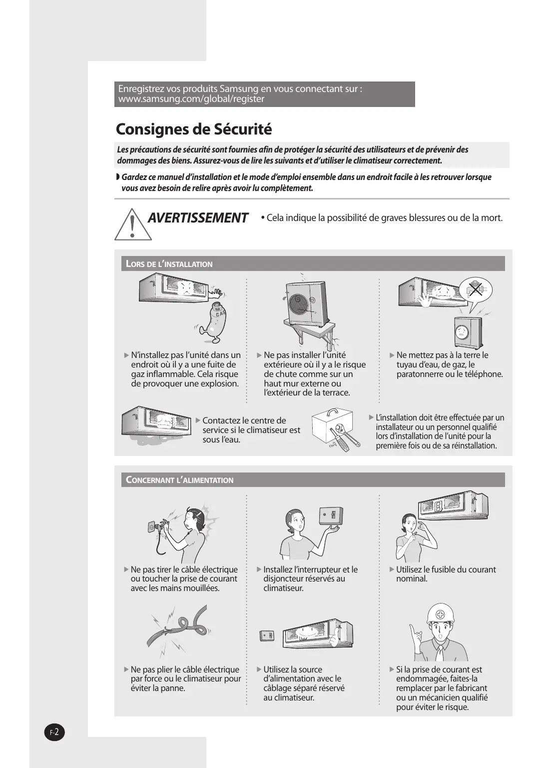 Les précautions de sécurité sont fournies afin de protéger la sécurité des utilisateurs et de prévenir des dommages des biens. Assurez-vous de lire les suivants et d’utiliser le climatiseur correctement. Gardez ce manuel d’installation et le mode d’emploi ensemble dans un endroit facile à les retrouver lorsque vous avez besoin de relire après avoir lu complètement.