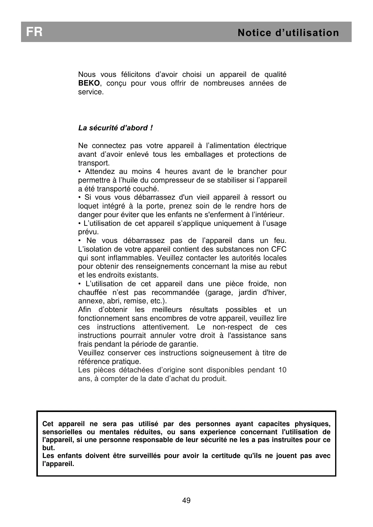 Index La sécurité d’abord /49 Conditions électriques /50 Instructions de transport /50 Instructions d’installation /50 Apprendre à connaître votre appareil /51 Suggestion d’agencement des denrées dans l’appareil /51 Commande de température et réglage /52 Avant l’utilisation /52 Conservation des denrées surgelées /52 Congélation des produits frais /52 Fabrication de glaçons /53 Dégivrage /53 Remplacer l'ampoule intérieure /53 Repositionnement de la porte /53 Nettoyage et entretien /54 À faire / À éviter /55 Diagnostic /56 Nous vous félicitons d’avoir choisi un appareil de qualité BEKO, conçu pour vous offrir de nombreuses années de service. La sécurité d’abord ! Ne connectez pas votre appareil à l’alimentation électrique avant d’avoir enlevé tous les emballages et protections de transport.