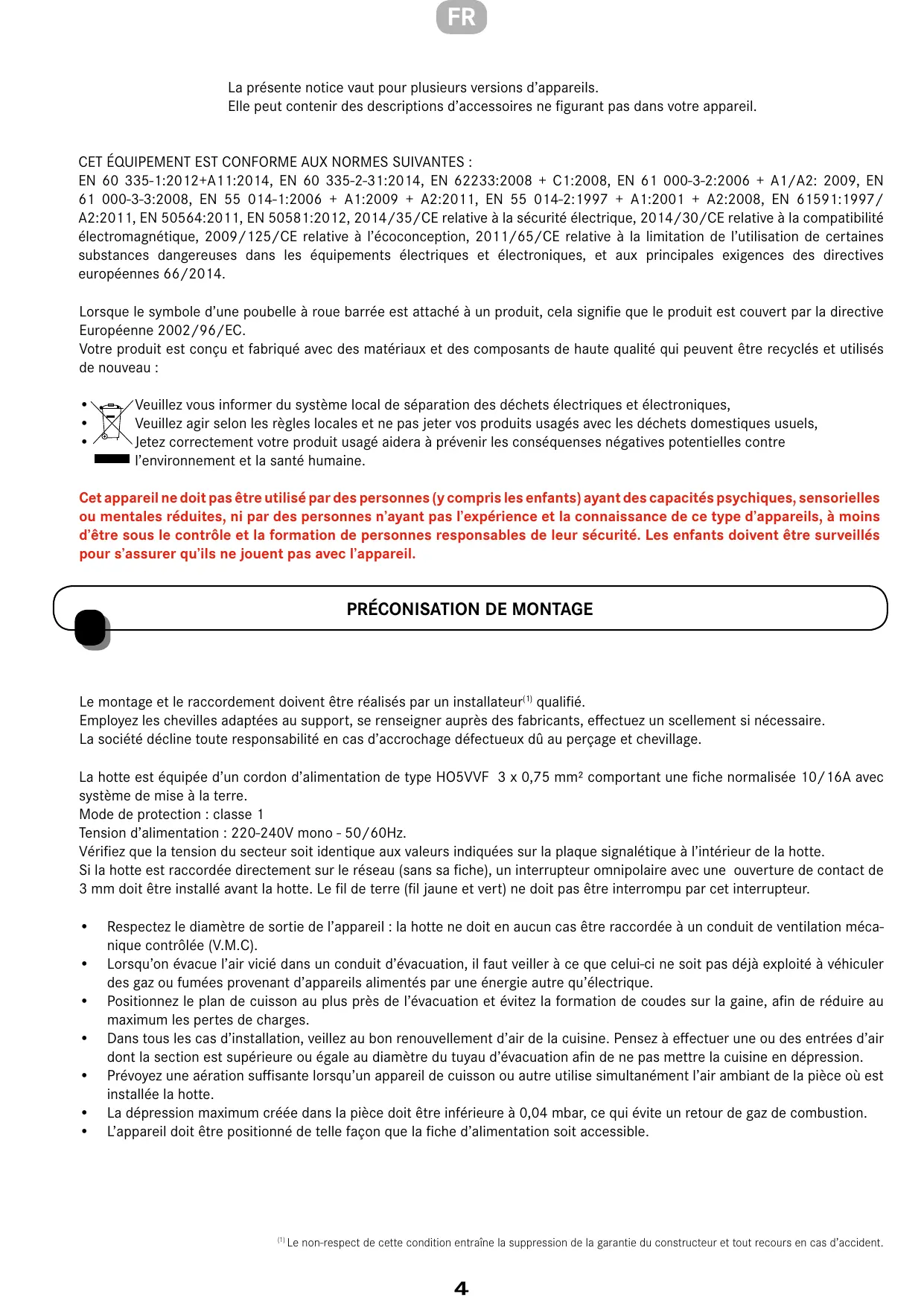 Veuillez vous informer du système local de séparation des déchets électriques et électroniques, Veuillez agir selon les règles locales et ne pas jeter vos produits usagés avec les déchets domestiques usuels, Jetez correctement votre produit usagé aidera à prévenir les conséquenses négatives potentielles contre l’environnement et la santé humaine. Cet appareil ne doit pas être utilisé par des personnes (y compris les enfants) ayant des capacités psychiques, sensorielles ou mentales réduites, ni par des personnes n’ayant pas l’expérience et la connaissance de ce type d’appareils, à moins d’être sous le contrôle et la formation de personnes responsables de leur sécurité. Les enfants doivent être surveillés pour s’assurer qu’ils ne jouent pas avec l’appareil. Le montage et le raccordement doivent être réalisés par un installateur(1) qualifié. Employez les chevilles adaptées au support, se renseigner auprès des fabricants, effectuez un scellement si nécessaire. La société décline toute responsabilité en cas d’accrochage défectueux dû au perçage et chevillage. La hotte est équipée d’un cordon d’alimentation de type HO5VVF 3 x 0,75 mm² comportant une fiche normalisée 10/16A avec système de mise à la terre. Mode de protection : classe 1 Tension d’alimentation : 220-240V mono - 50/60Hz. Vérifiez que la tension du secteur soit identique aux valeurs indiquées sur la plaque signalétique à l’intérieur de la hotte. Si la hotte est raccordée directement sur le réseau (sans sa fiche), un interrupteur omnipolaire avec une ouverture de contact de 3 mm doit être installé avant la hotte. Le fil de terre (fil jaune et vert) ne doit pas être interrompu par cet interrupteur.