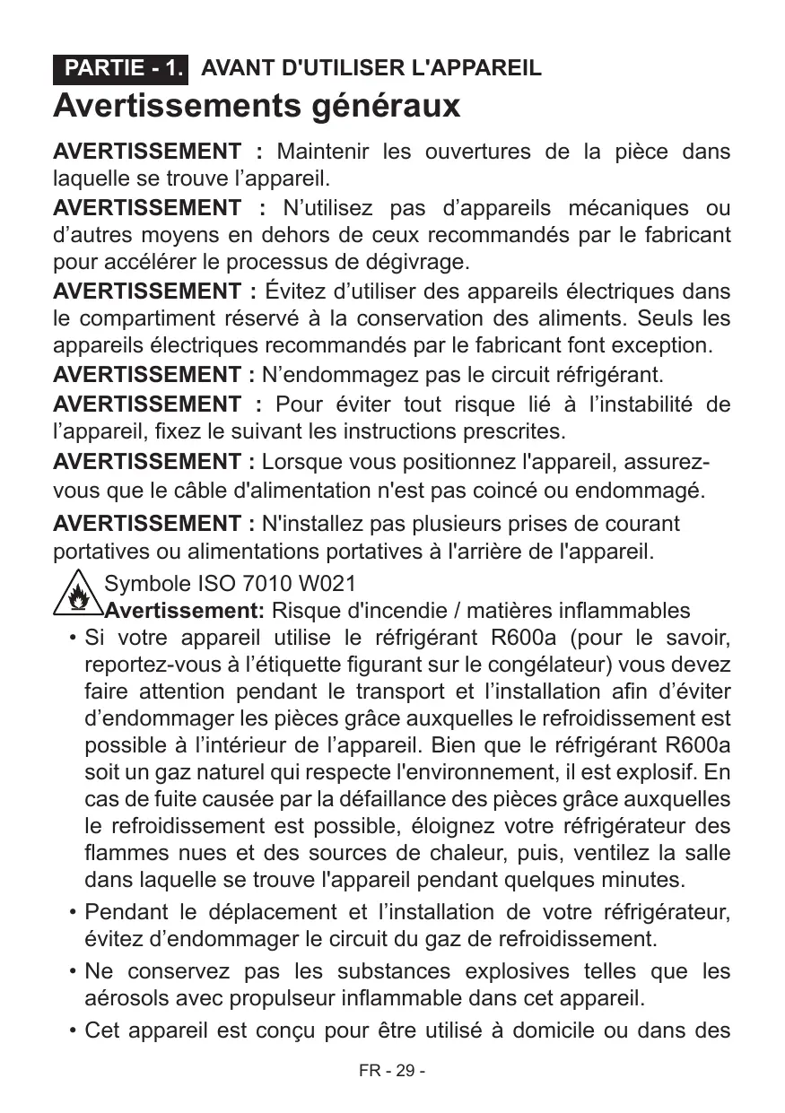 AVERTISSEMENT : Maintenir les ouvertures de la pièce dans laquelle se trouve l’appareil. AVERTISSEMENT : N’utilisez pas d’appareils mécaniques ou d’autres moyens en dehors de ceux recommandés par le fabricant pour accélérer le processus de dégivrage. AVERTISSEMENT : Évitez d’utiliser des appareils électriques dans le compartiment réservé à la conservation des aliments. Seuls les appareils électriques recommandés par le fabricant font exception. AVERTISSEMENT : N’endommagez pas le circuit réfrigérant. AVERTISSEMENT : Pour éviter tout risque lié à l’instabilité de l’appareil, fixez le suivant les instructions prescrites. AVERTISSEMENT : Lorsque vous positionnez l'appareil, assurezvous que le câble d'alimentation n'est pas coincé ou endommagé. AVERTISSEMENT : N'installez pas plusieurs prises de courant portatives ou alimentations portatives à l'arrière de l'appareil. Symbole ISO 7010 W021 Avertissement: Risque d'incendie / matières inflammables • Si votre appareil utilise le réfrigérant R600a (pour le savoir, reportez-vous à l’étiquette figurant sur le congélateur) vous devez faire attention pendant le transport et l’installation afin d’éviter d’endommager les pièces grâce auxquelles le refroidissement est possible à l’intérieur de l’appareil. Bien que le réfrigérant R600a soit un gaz naturel qui respecte l'environnement, il est explosif. En cas de fuite causée par la défaillance des pièces grâce auxquelles le refroidissement est possible, éloignez votre réfrigérateur des flammes nues et des sources de chaleur, puis, ventilez la salle dans laquelle se trouve l'appareil pendant quelques minutes. • Pendant le déplacement et l’installation de votre réfrigérateur, évitez d’endommager le circuit du gaz de refroidissement. • Ne conservez pas les substances explosives telles que les aérosols avec propulseur inflammable dans cet appareil. • Cet appareil est conçu pour être utilisé à domicile ou dans des FR - 29 -