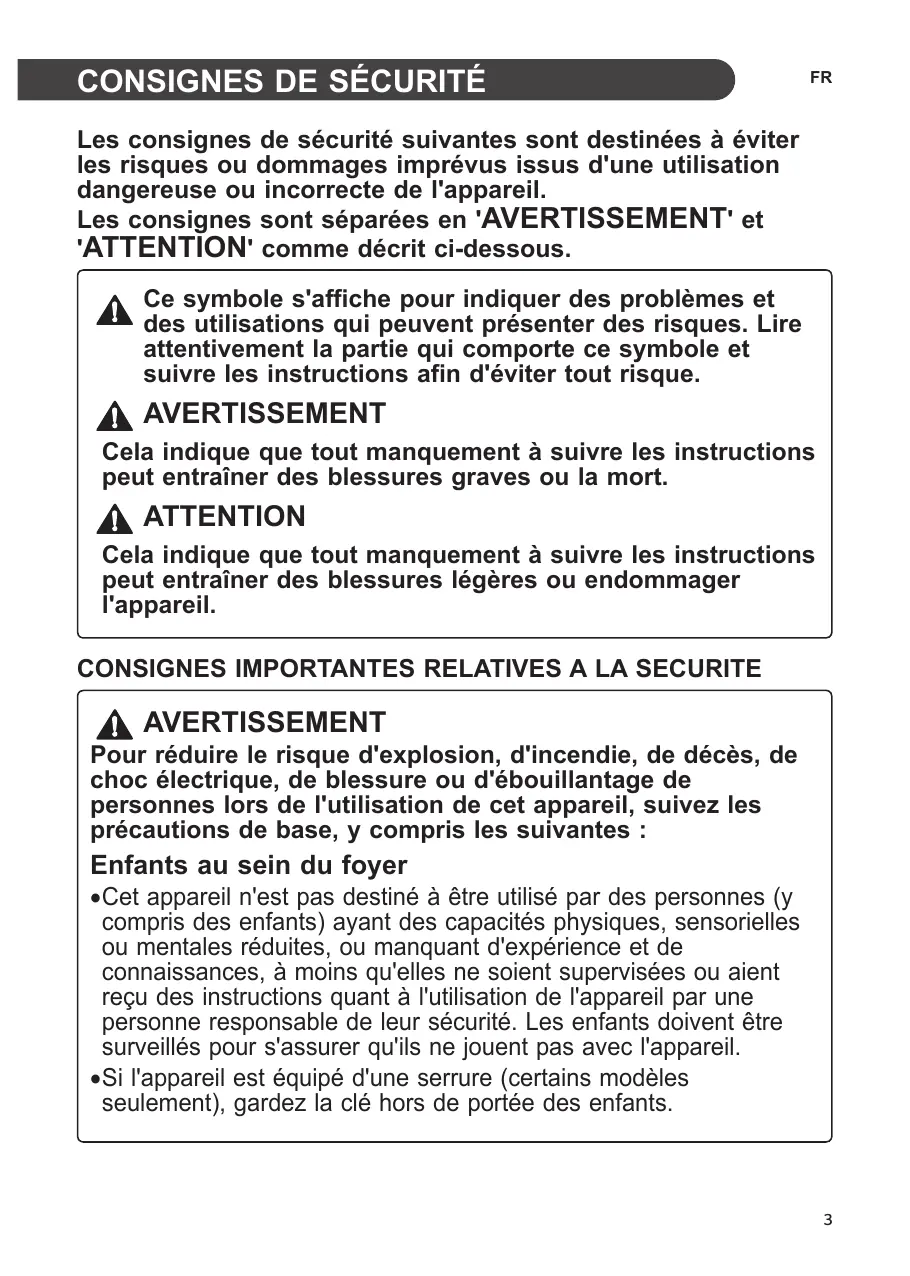- DÉPANNAGE Les consignes de sécurité suivantes sont destinées à éviter les risques ou dommages imprévus issus d'une utilisation dangereuse ou incorrecte de l'appareil. Les consignes sont séparées en 'AVERTISSEMENT' et 'ATTENTION' comme décrit ci-dessous. Ce symbole s'affiche pour indiquer des problèmes et des utilisations qui peuvent présenter des risques. Lire attentivement la partie qui comporte ce symbole et suivre les instructions afin d'éviter tout risque. AVERTISSEMENT Cela indique que tout manquement à suivre les instructions peut entraîner des blessures graves ou la mort. ATTENTION Cela indique que tout manquement à suivre les instructions peut entraîner des blessures légères ou endommager l'appareil. Pour réduire le risque d'explosion, d'incendie, de décès, de choc électrique, de blessure ou d'ébouillantage de personnes lors de l'utilisation de cet appareil, suivez les précautions de base, y compris les suivantes : Enfants au sein du foyer p. 30