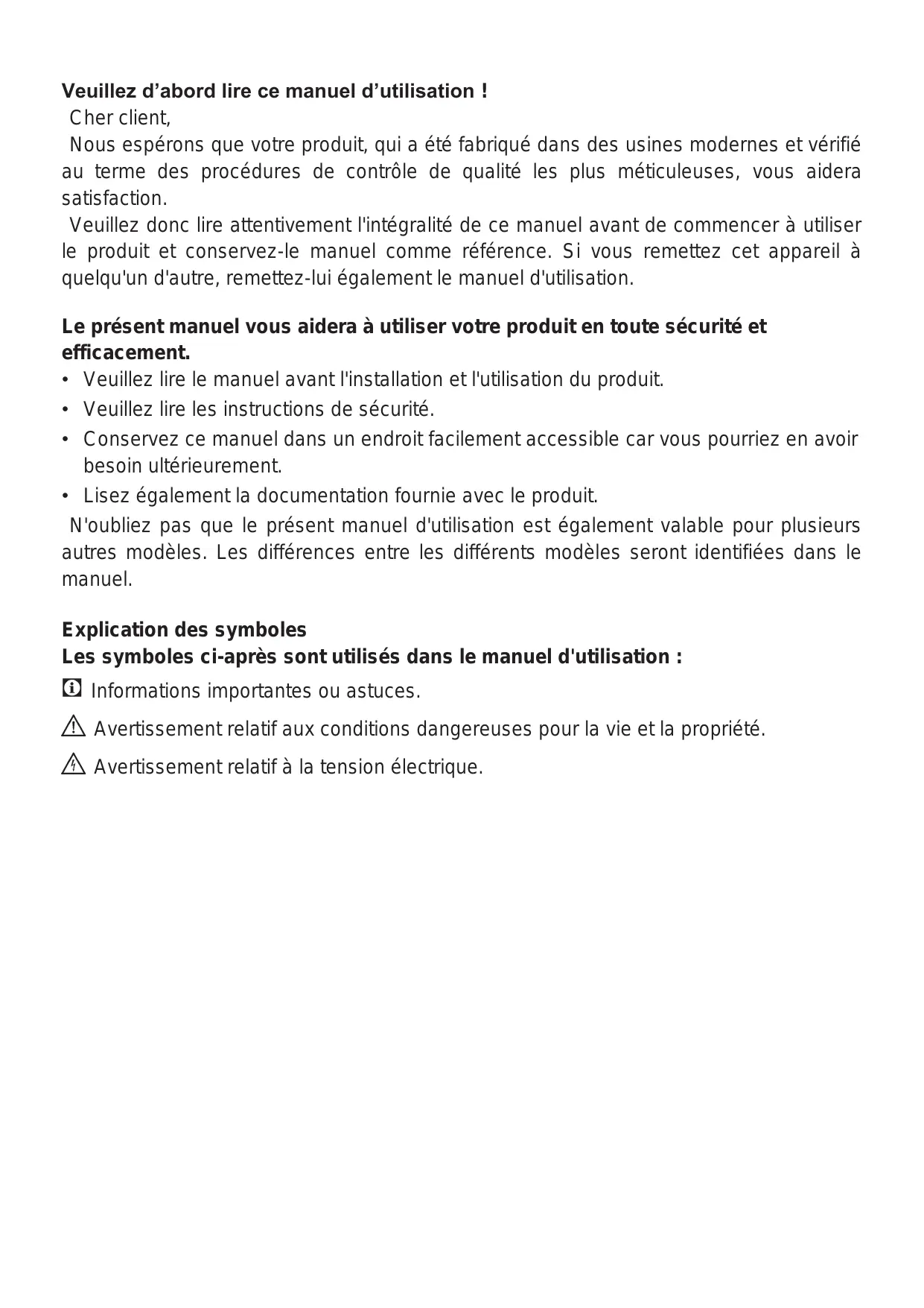 2 Précautions de sécurité importantes Veuillez examiner les informations suivantes : Le non respect de ces consignes peut entraîner des blessures ou dommages matériels. Sinon, tout engagement lié à la garantie et à la fiabilité du produit devient invalide. Les pièces détachées d’origine sont disponibles pendant 10 ans, à compter de la date d’achat du produit.