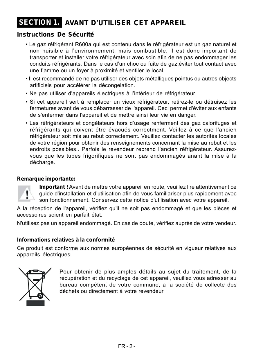• Si cet appareil sert à remplacer un vieux réfrigérateur, retirez-le ou détruisez les fermetures avant de vous débarrasser de l'appareil. Ceci permet d'éviter aux enfants de s'enfermer dans l'appareil et de mettre ainsi leur vie en danger. • Les réfrigérateurs et congélateurs hors d’usage renferment des gaz calorifuges et réfrigérants qui doivent étre évacués correctment. Veillez à ce que l'ancien réfrigérateur soit mis au rebut correctement. Veuillez contacter les autorités locales de votre région pour obtenir des renseignements concernant la mise au rebut et les endroits possibles.. Parfois le revendeur reprend l’ancien réfrigérateur. Assurezvous que les tubes frigorifiques ne sont pas endommagés anant la mise à la décharge. Remarque importante: Important ! Avant de mettre votre appareil en route, veuillez lire attentivement ce guide d'installation et d'utilisation afin de vous familiariser plus rapidement avec son fonctionnement. Conservez cette notice d'utilisation avec votre appareil. A la réception de l'appareil, vérifiez qu'il ne soit pas endommagé et que les pièces et accessoires soient en parfait état. N'utilisez pas un appareil endommagé. En cas de doute, vérifiez auprès de votre vendeur. Informations relatives à la conformité Ce produit est conforme aux normes européennes de sécurité en vigueur relatives aux appareils électriques. Pour obtenir de plus amples détails au sujet du traitement, de la récupération et du recyclage de cet appareil, veuillez vous adresser au bureau compétent de votre commune, à la société de collecte des déchets ou directement à votre revendeur.