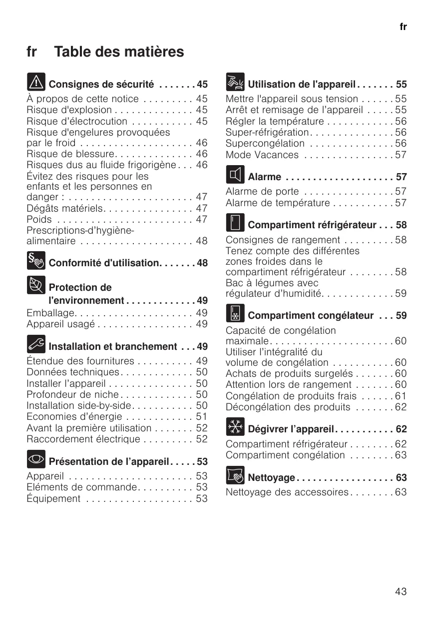 Pendant la décongélation, des bactéries peuvent apparaître et les produits congelés s'abîmer Ne remettez pas à congeler des produits alimentaires partiellement ou entièrement décongelés. Ne recongelez qu'après avoir les avoir fait cuire ou rôtir. N’utilisez pas la durée de conservation dans son intégralité. Remarque : L’alarme peut s’activer dans les cas suivants, sans qu'il y ait de risque pour les produits congelés : ■ Pendant l'entrée en service de l’appareil. ■ Rangement de grandes quantités de produits alimentaires frais. ■ La porte du compartiment congélateur est restée trop longtemps ouverte.