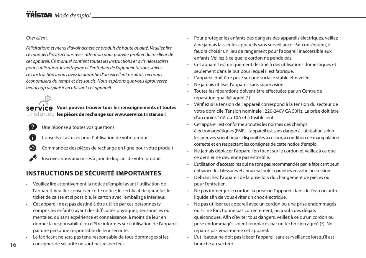 Vous pouvez trouver tous les renseignements et toutes les pièces de rechange sur www.service.tristar.eu !