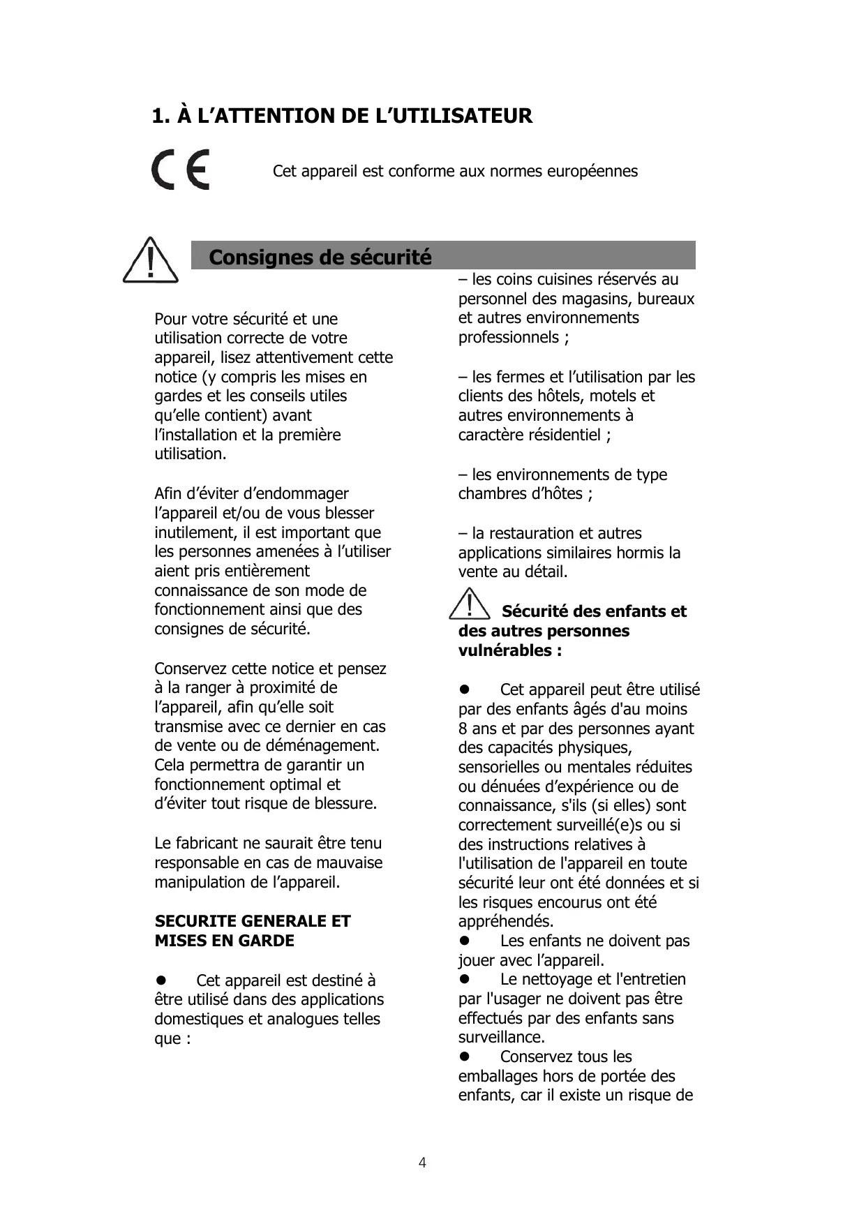 1. À L’ATTENTION DE L’UTILISATEUR Cet appareil est conforme aux normes européennes