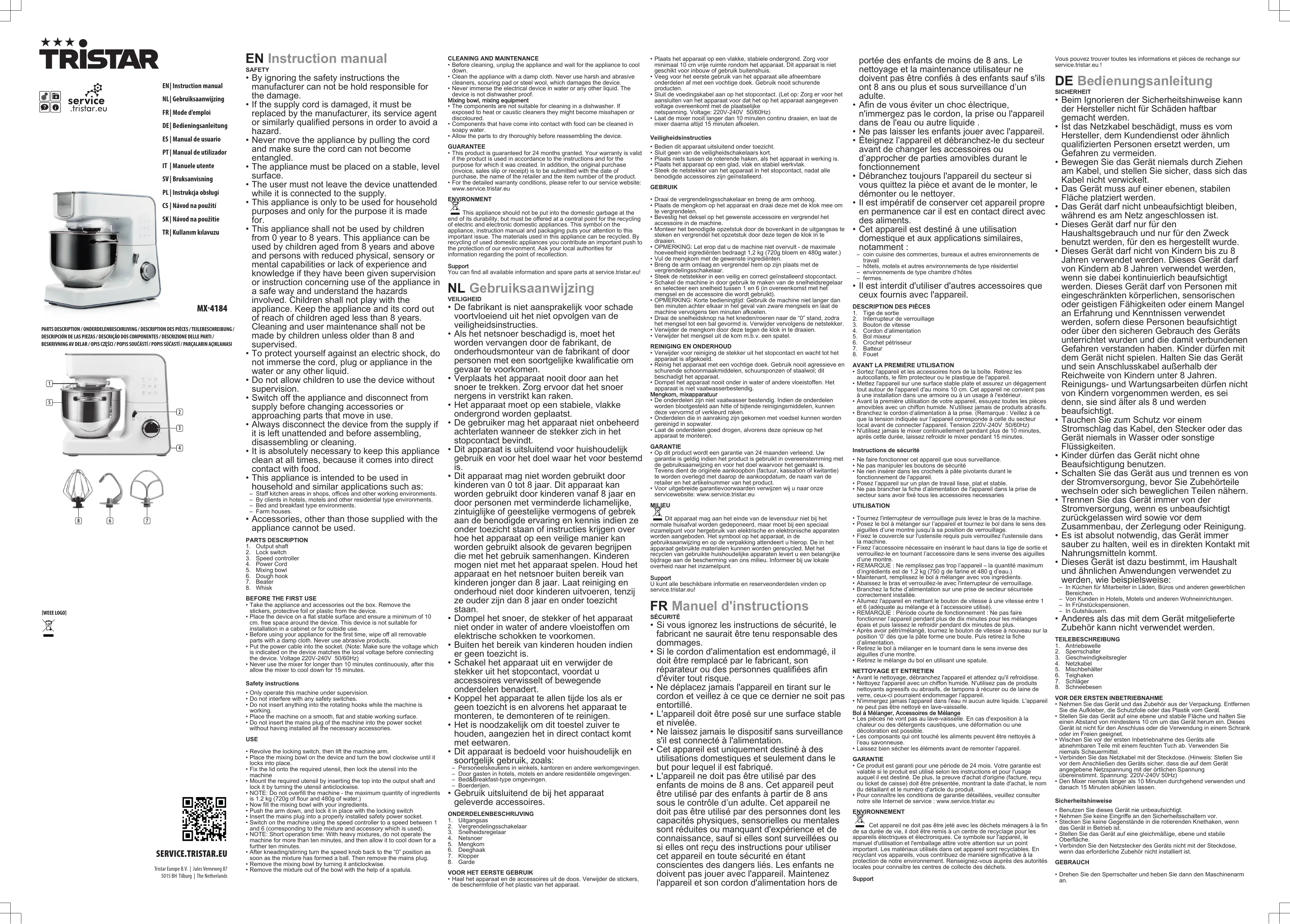 - Pour connaître les conditions de garantie détaillées, veuillez consulter notre site Internet de service : www.service.tristar.eu ENVIRONNEMENT Cet appareil ne doit pas être jeté avec les déchets ménagers à la fin de sa durée de vie, il doit être remis à un centre de recyclage pour les appareils électriques et électroniques. Ce symbole sur l'appareil, le manuel d'utilisation et l'emballage attire votre attention sur un point important. Les matériaux utilisés dans cet appareil sont recyclables. En recyclant vos appareils, vous contribuez de manière significative à la protection de notre environnement. Renseignez-vous auprès des autorités locales pour connaître les centres de collecte des déchets. Support Vous pouvez trouver toutes les informations et pièces de rechange sur service.tristar.eu ! DE Bedienungsanleitung SICHERHEIT