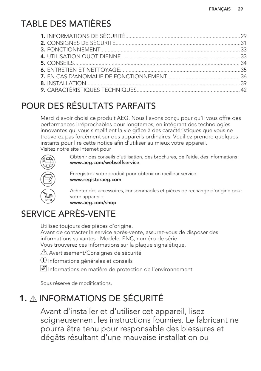 TABLE DES MATIÈRES 1. INFORMATIONS DE SÉCURITÉ29 2. CONSIGNES DE SÉCURITÉ31 3. FONCTIONNEMENT 33 4. UTILISATION QUOTIDIENNE 33 5. CONSEILS 34 6. ENTRETIEN ET NETTOYAGE35 7. EN CAS D'ANOMALIE DE FONCTIONNEMENT 36 8. INSTALLATION39 9. CARACTÉRISTIQUES TECHNIQUES 42
