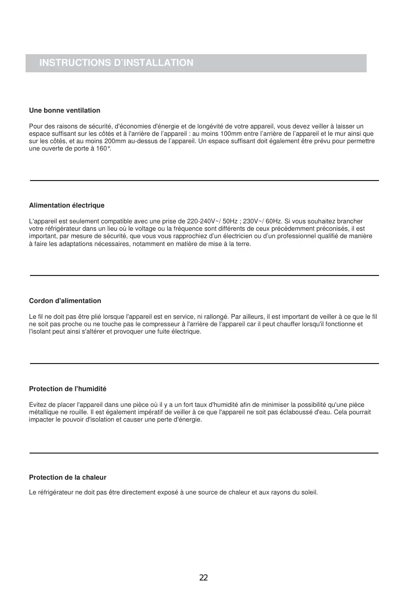 Pour des raisons de sécurité, d'économies d'énergie et de longévité de votre appareil, vous devez veiller à laisser un espace suffisant sur les côtés et à l'arrière de l’appareil : au moins 100mm entre l’arrière de l’appareil et le mur ainsi que sur les côtés, et au moins 200mm au-dessus de l’appareil. Un espace suffisant doit également être prévu pour permettre une ouverte de porte à 160°.
