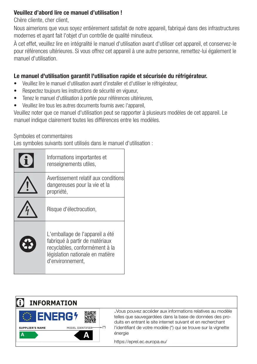 Le manuel d'utilisation garantit l'utilisation rapide et sécurisée du réfrigérateur.