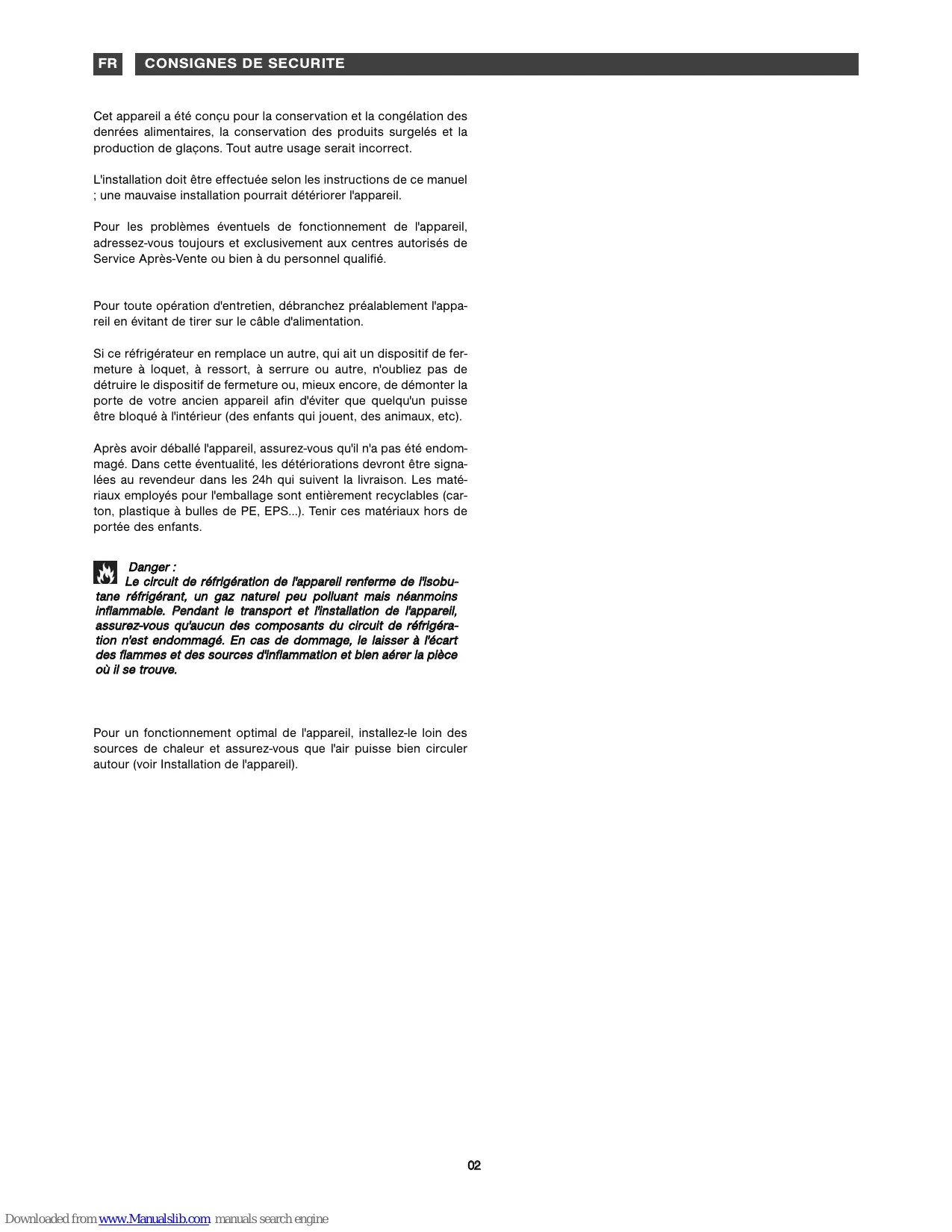Le circuit de réfrigération de l'appareil renferme de l'isobutane réfrigérant, un gaz naturel peu polluant mais néanmoins inflammable. Pendant le transport et l'installation de l'appareil, assurez-vous qu'aucun des composants du circuit de réfrigération n'est endommagé. En cas de dommage, le laisser à l'écart des flammes et des sources d'inflammation et bien aérer la pièce où il se trouve.