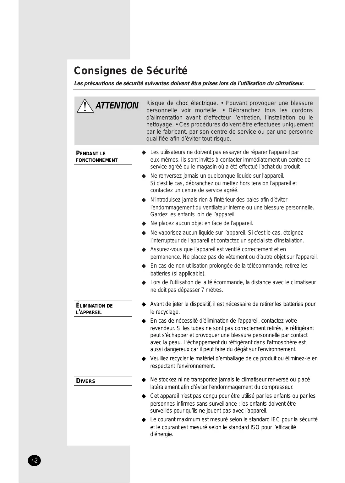 GEBRAUCHSANWEISUNG E§§HNIKA ¢IAIPOYMENO K§IMATI™TIKO ¢øMATIOY(æ‡Í˘) E S F I P D G DB98-16151A(2) Consignes de Sécurité Les précautions de sécurité suivantes doivent être prises lors de l’utilisation du climatiseur. ATTENTION PENDANT LE FONCTIONNEMENT Risque de choc électrique. • Pouvant provoquer une blessure personnelle voir mortelle. • Débranchez tous les cordons d’alimentation avant d’effecteur l’entretien, l’installation ou le nettoyage. • Ces procédures doivent être effectuées uniquement par le fabricant, par son centre de service ou par une personne qualifiée afin d’éviter tout risque. ◆ Les utilisateurs ne doivent pas essayer de réparer l’appareil par eux-mêmes. Ils sont invités à contacter immédiatement un centre de service agréé ou le magasin où a été effectué l’achat du produit. ◆ Ne renversez jamais un quelconque liquide sur l’appareil. Si c’est le cas, débranchez ou mettez hors tension l’appareil et contactez un centre de service agréé. ◆ N’introduisez jamais rien à l’intérieur des pales afin d’éviter l’endommagement du ventilateur interne ou une blessure personnelle. Gardez les enfants loin de l’appareil. ◆ Ne placez aucun objet en face de l’appareil. ◆ Ne vaporisez aucun liquide sur l’appareil. Si c’est le cas, éteignez l’interrupteur de l’appareil et contactez un spécialiste d’installation. ◆ Assurez-vous que l’appareil est ventilé correctement et en permanence. Ne placez pas de vêtement ou d’autre objet sur l’appareil. ◆ En cas de non utilisation prolongée de la télécommande, retirez les batteries (si applicable). ◆ Lors de l’utilisation de la télécommande, la distance avec le climatiseur ne doit pas dépasser 7 métres. ÉLIMINATION DE L’APPAREIL ◆ Avant de jeter le dispositif, il est nécessaire de retirer les batteries pour le recyclage. ◆ En cas de nécessité d’élimination de l’appareil, contactez votre revendeur. Si les tubes ne sont pas correctement retirés, le réfrigérant peut s’échapper et provoquer une blessure personnelle par contact avec la peau. L’échappement du réfrigérant dans l’atmosphère est aussi dangereux car il peut faire du dégât sur l’environnement. ◆ Veuillez recycler le matériel d’emballage de ce produit ou éliminez-le en respectant l’environnement. DIVERS ◆ Ne stockez ni ne transportez jamais le climatiseur renversé ou placé latéralement afin d’éviter l’endommagement du compresseur. ◆ Cet appareil n’est pas conçu pour être utilisé par les enfants ou par les personnes infirmes sans surveillance : les enfants doivent être surveillés pour qu’ils ne jouent pas avec l’appareil. ◆ Le courant maximum est mesuré selon le standard IEC pour la sécurité et le courant est mesuré selon le standard ISO pour l’efficacité d’énergie. F-2