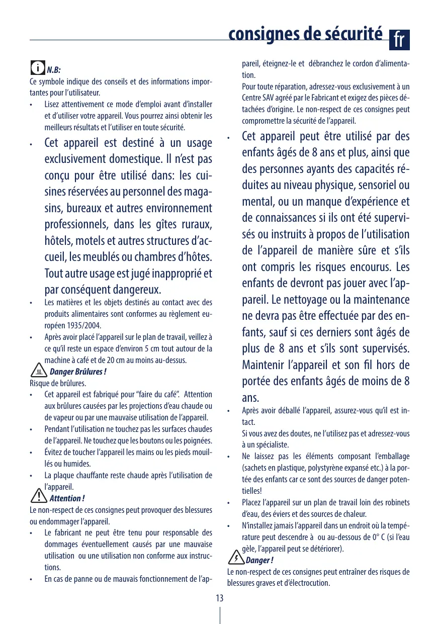 Si vous avez des doutes, ne l’utilisez pas et adressez-vous à un spécialiste. • Ne laissez pas les éléments composant l’emballage (sachets en plastique, polystyrène expansé etc.) à la portée des enfants car ce sont des sources de danger potentielles! • Placez l’appareil sur un plan de travail loin des robinets d’eau, des éviers et des sources de chaleur. • N’installez jamais l’appareil dans un endroit où la température peut descendre à ou au-dessous de 0° C (si l’eau gèle, l’appareil peut se détériorer). Danger ! Le non-respect de ces consignes peut entraîner des risques de blessures graves et d’électrocution.