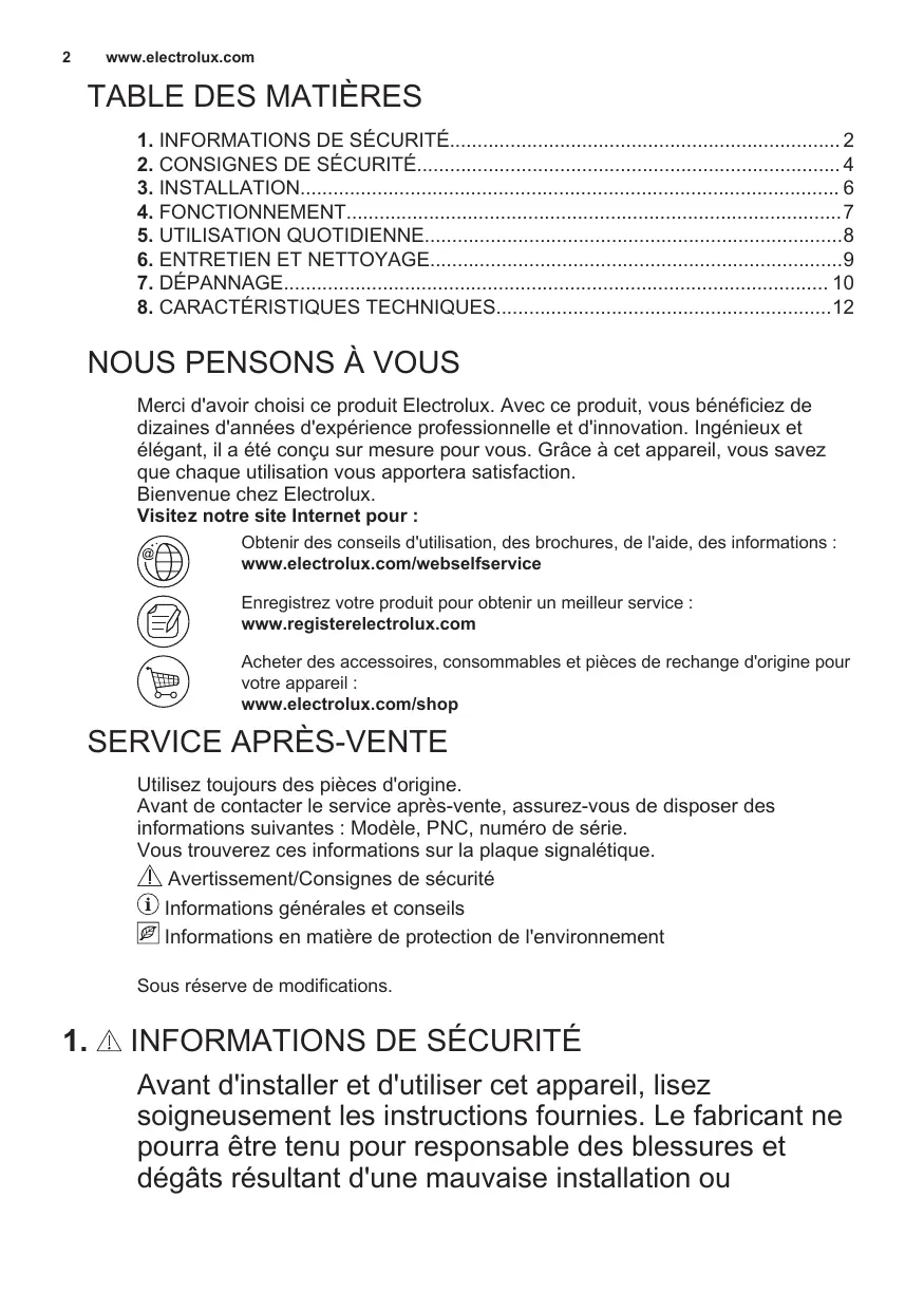 NOUS PENSONS À VOUS Merci d'avoir choisi ce produit Electrolux. Avec ce produit, vous bénéficiez de dizaines d'années d'expérience professionnelle et d'innovation. Ingénieux et