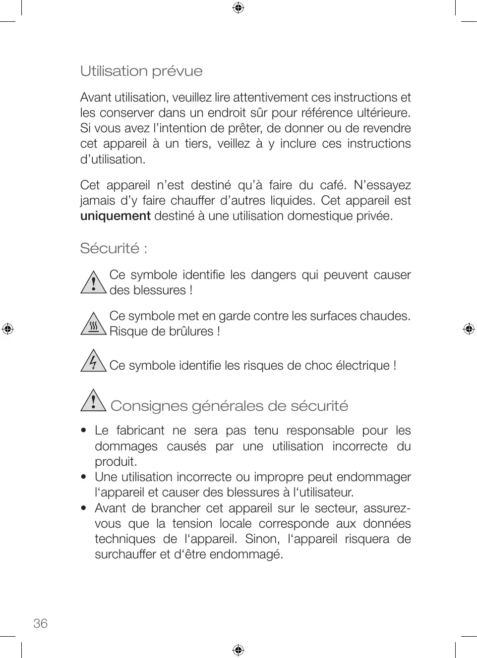 Utilisation prévue Avant utilisation, veuillez lire attentivement ces instructions et les conserver dans un endroit sûr pour référence ultérieure. Si vous avez l’intention de prêter, de donner ou de revendre cet appareil à un tiers, veillez à y inclure ces instructions d’utilisation. Cet appareil n’est destiné qu’à faire du café. N’essayez jamais d’y faire chauffer d’autres liquides. Cet appareil est uniquement destiné à une utilisation domestique privée. Sécurité : Ce symbole identifie les dangers qui peuvent causer des blessures ! Ce symbole met en garde contre les surfaces chaudes. Risque de brûlures ! Ce symbole identifie les risques de choc électrique ! Consignes générales de sécurité
