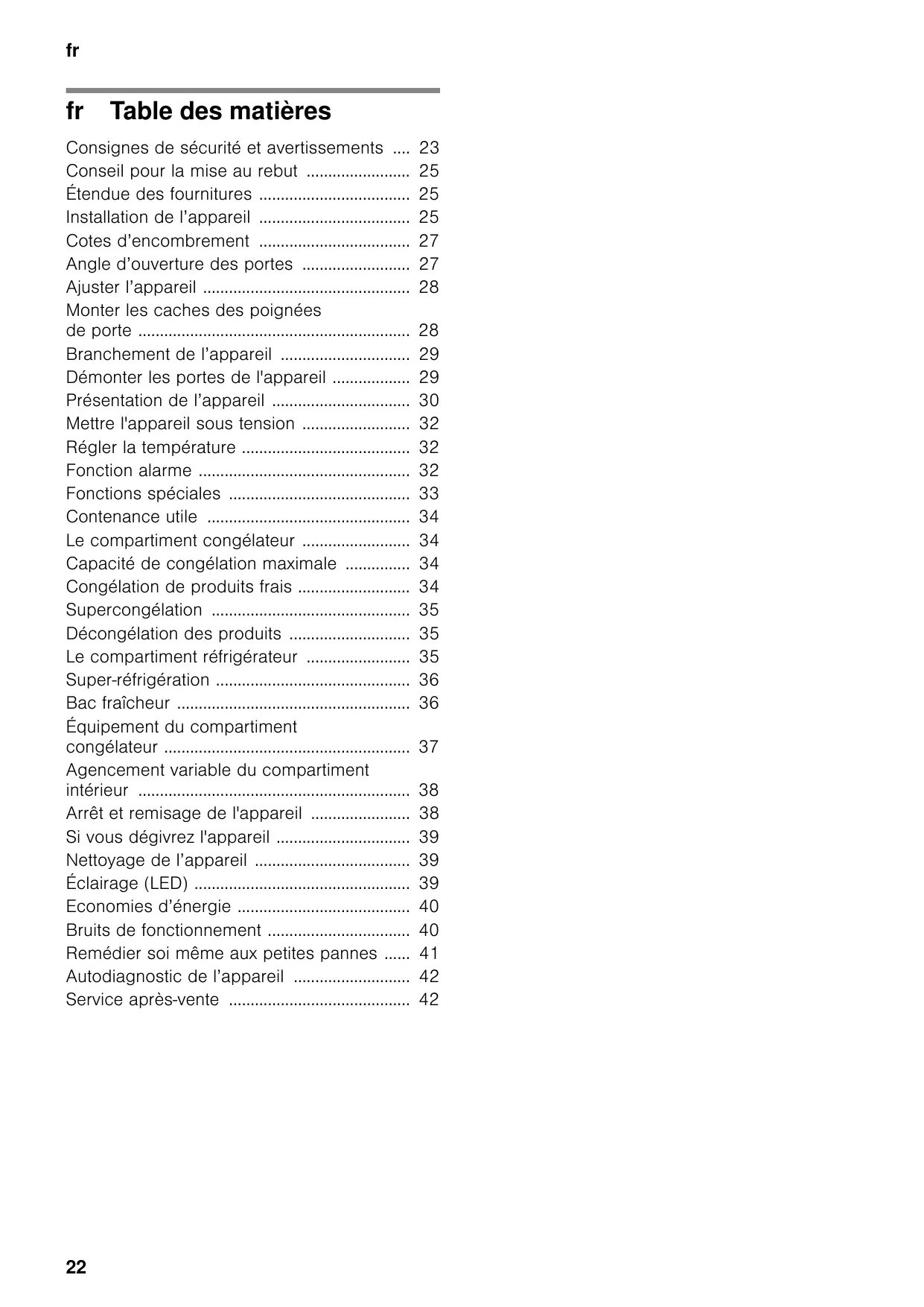 Table des matières frNotice de montage t d’utilsation Consignes de sécurité et avertissements .... Conseil pour la mise au rebut ........................ Étendue des fournitures ................................... Installation de l’appareil ................................... Cotes d’encombrement ................................... Angle d’ouverture des portes ......................... Ajuster l’appareil ................................................ Monter les caches des poignées de porte ............................................................... Branchement de l’appareil .............................. Démonter les portes de l'appareil .................. Présentation de l’appareil ................................ Mettre l'appareil sous tension ......................... Régler la température ....................................... Fonction alarme ................................................. Fonctions spéciales .......................................... Contenance utile ............................................... Le compartiment congélateur ......................... Capacité de congélation maximale ............... Congélation de produits frais .......................... Supercongélation .............................................. Décongélation des produits ............................ Le compartiment réfrigérateur ........................ Super-réfrigération ............................................. Bac fraîcheur ...................................................... Équipement du compartiment congélateur ......................................................... Agencement variable du compartiment intérieur ............................................................... Arrêt et remisage de l'appareil ....................... Si vous dégivrez l'appareil ............................... Nettoyage de l’appareil .................................... Éclairage (LED) .................................................. Economies d’énergie ........................................ Bruits de fonctionnement ................................. Remédier soi même aux petites pannes ...... Autodiagnostic de l’appareil ........................... Service après-vente ..........................................