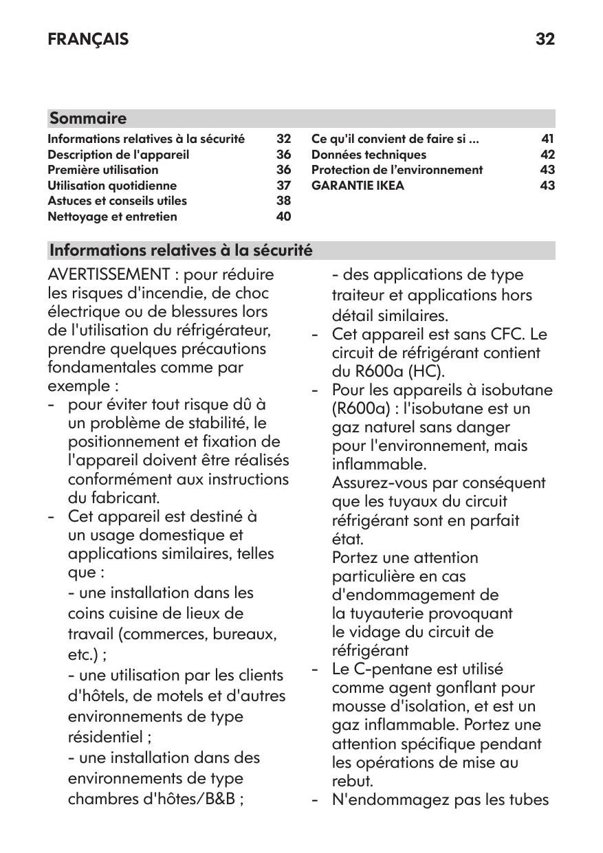 GARANTIE IKEA Informations relatives à la sécurité AVERTISSEMENT : pour réduire les risques d'incendie, de choc électrique ou de blessures lors de l'utilisation du réfrigérateur, -prendre quelques précautions fondamentales comme par exemple : --- pour éviter tout risque dû à un problème de stabilité, le positionnement et fixation de l'appareil doivent être réalisés conformément aux instructions du fabricant. -- Cet appareil est destiné à un usage domestique et applications similaires, telles que : - une installation dans les coins cuisine de lieux de travail (commerces, bureaux, etc.) ; -- une utilisation par les clients d'hôtels, de motels et d'autres environnements de type résidentiel ; - une installation dans des environnements de type chambres d'hôtes/B&B ; --
