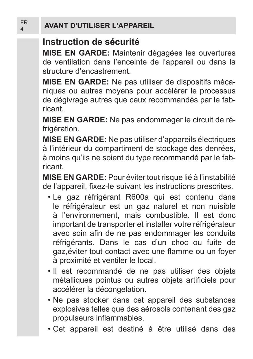MISE EN GARDE: Ne pas utiliser d’appareils électriques à l’intérieur du compartiment de stockage des denrées, à moins qu’ils ne soient du type recommandé par le fabricant. MISE EN GARDE: Pour éviter tout risque lié à l’instabilité de l’appareil, fixez-le suivant les instructions prescrites. • Le gaz réfrigérant R600a qui est contenu dans le réfrigérateur est un gaz naturel et non nuisible à l’environnement, mais combustible. Il est donc important de transporter et installer votre réfrigérateur avec soin afin de ne pas endommager les conduits réfrigérants. Dans le cas d’un choc ou fuite de gaz,éviter tout contact avec une flamme ou un foyer à proximité et ventiler le local. • Il est recommandé de ne pas utiliser des objets métalliques pointus ou autres objets artificiels pour accélérer la décongelation. • Ne pas stocker dans cet appareil des substances explosives telles que des aérosols contenant des gaz propulseurs inflammables. • Cet appareil est destiné à être utilisé dans des